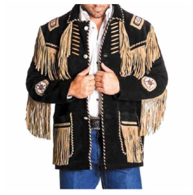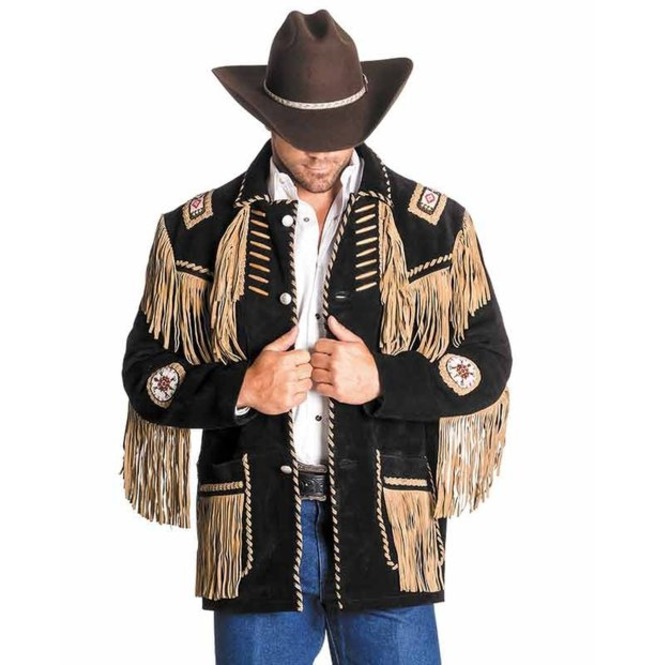 Men's Black Western Style Cowboy Suede Leather Jacket With Fringes and Beads
