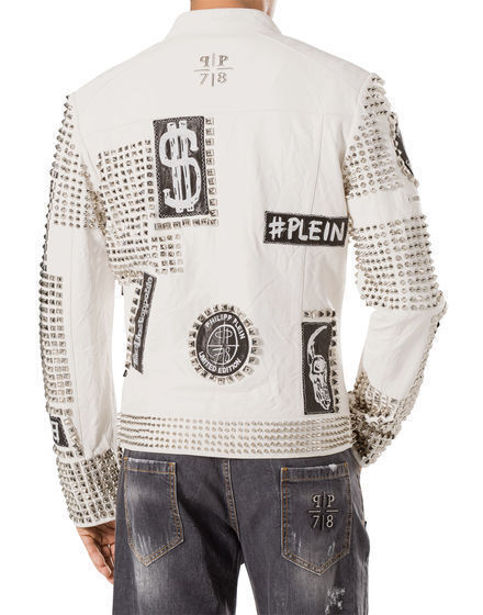 New Philip Plein White Full Studded Embroidery Patches Leather jacket for Men