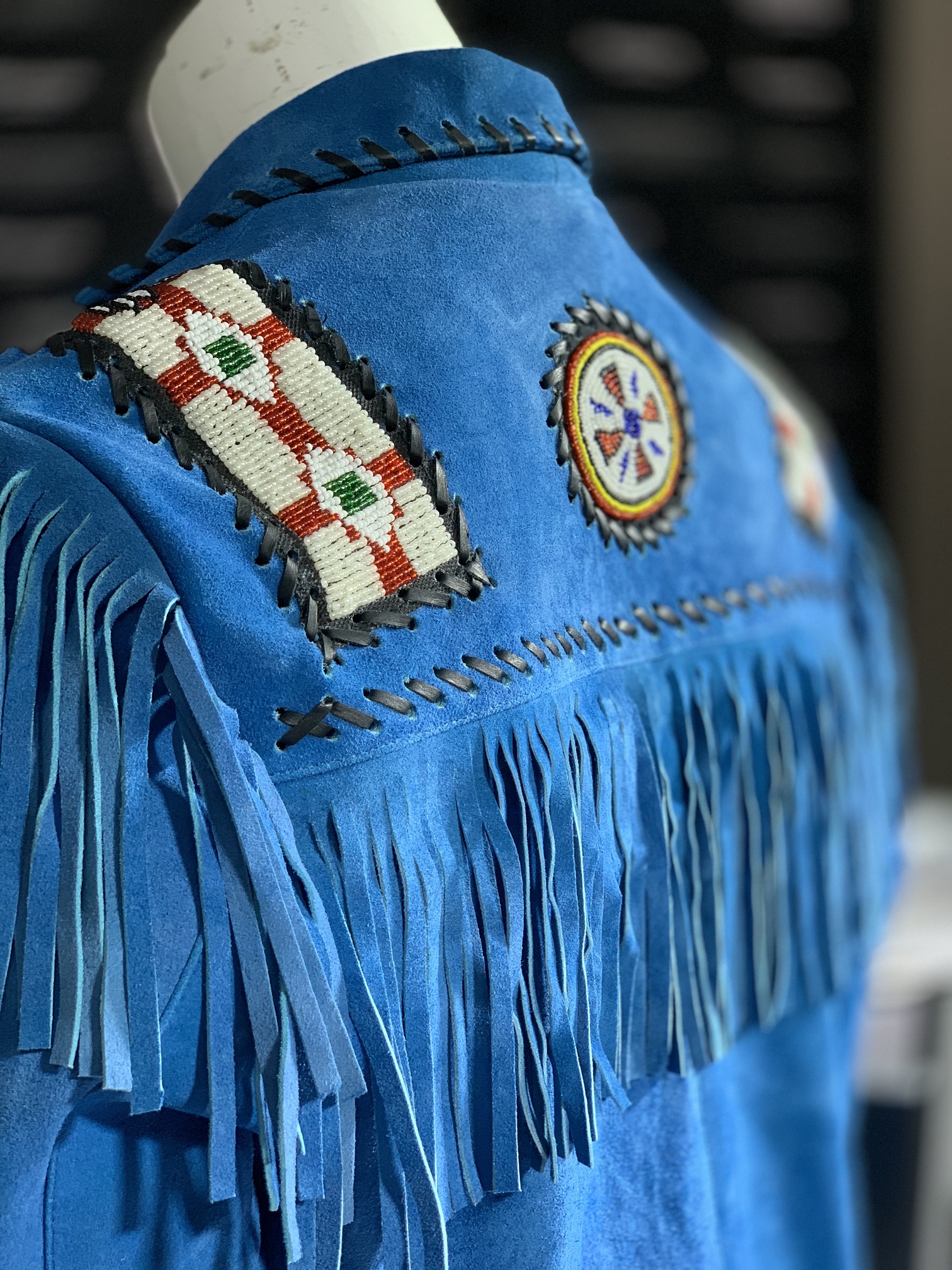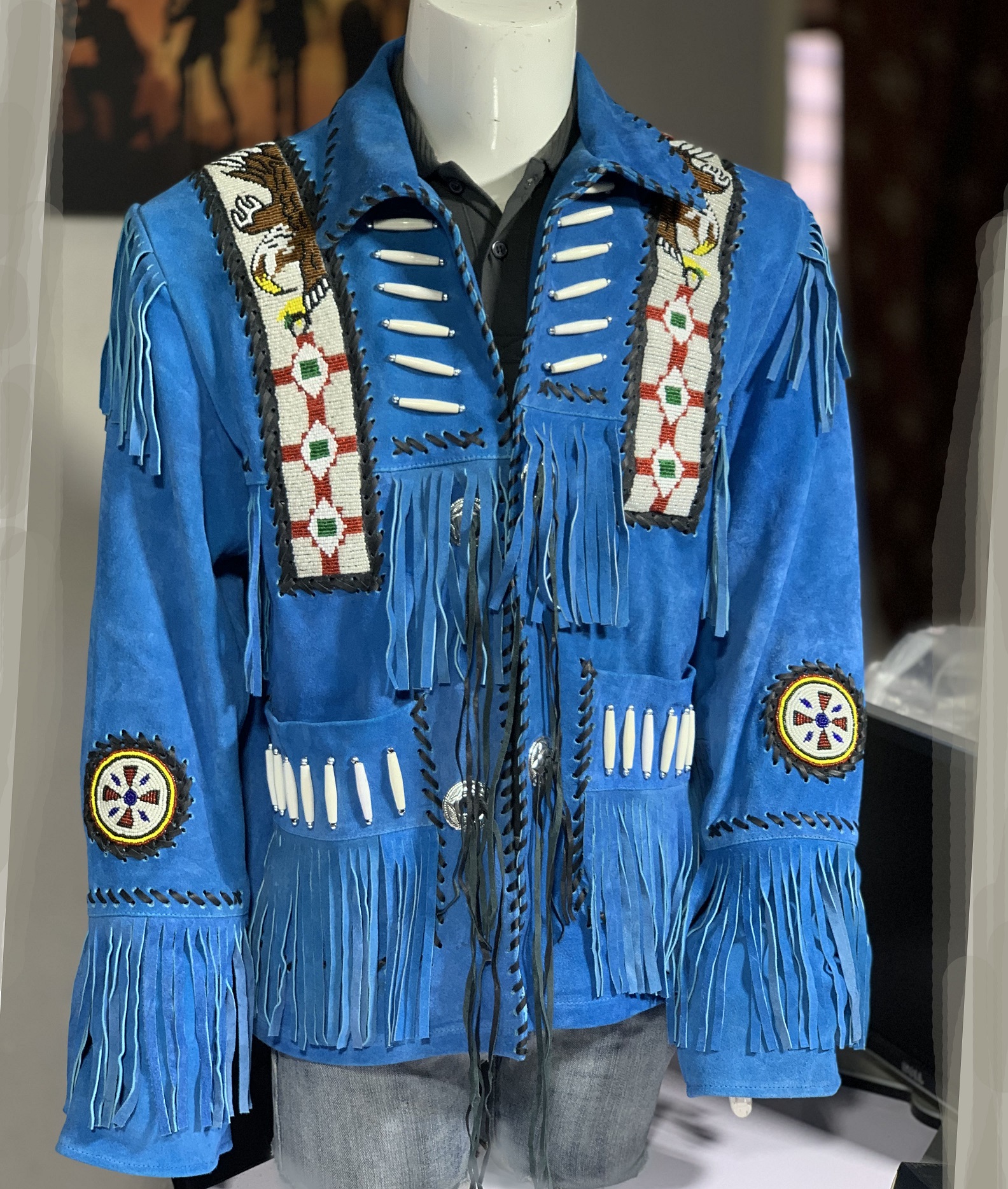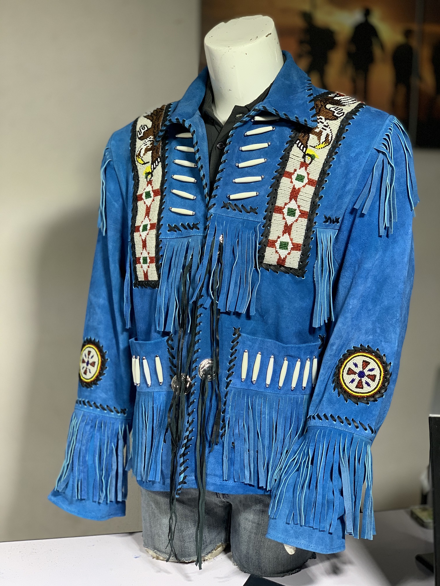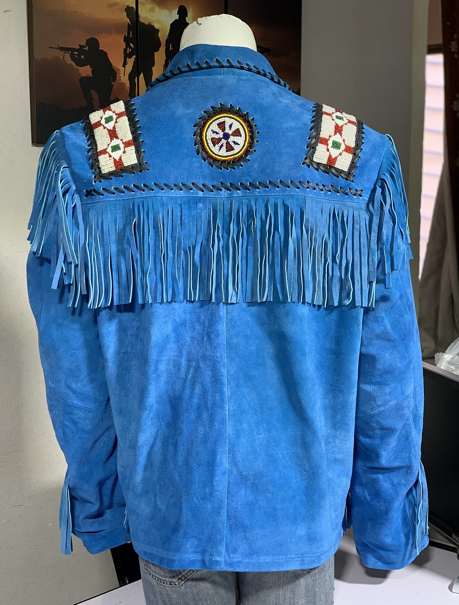 Royal Blue Western Style Cowboy Leather Jacket For Men With Fringes and Beads