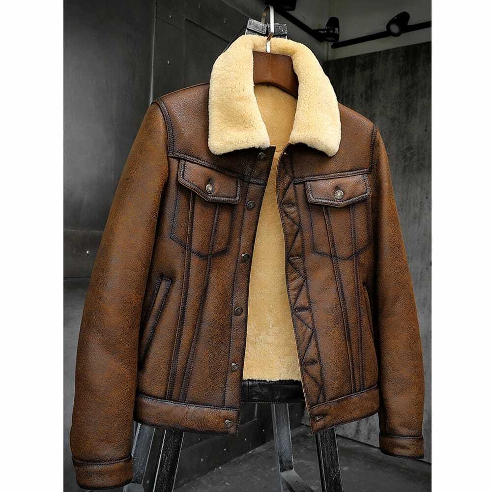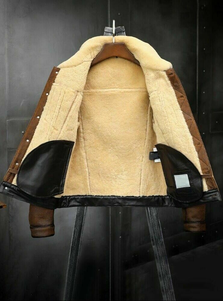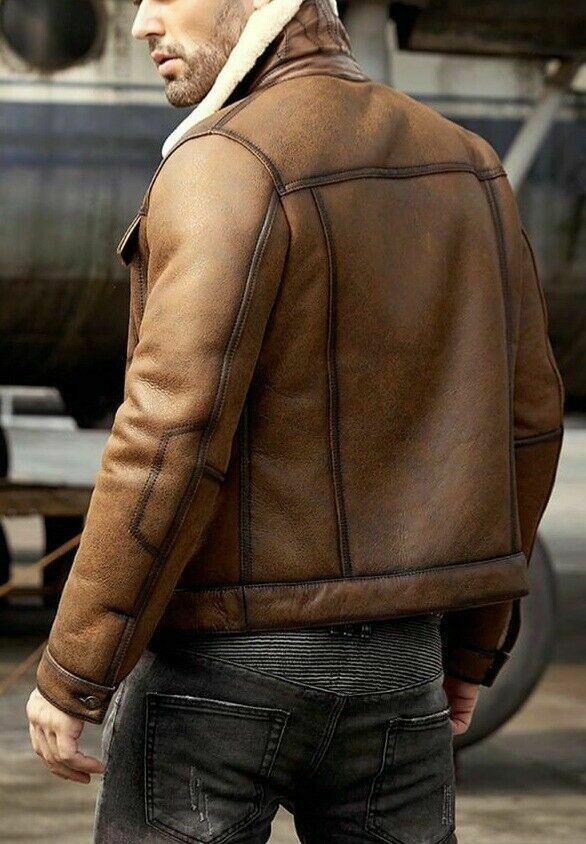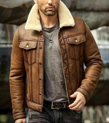 Men’s RAF B3 Bomber Flight Aviator Sheepskin Leather Jacket Denim style with Fur