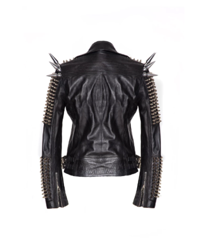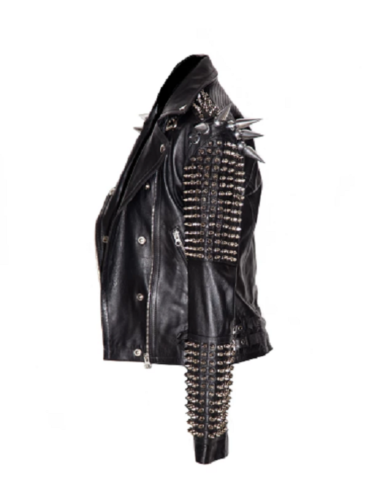 Men Silver Studded Long Spiked Jacket Leather Black Rock Punk Style Jacket