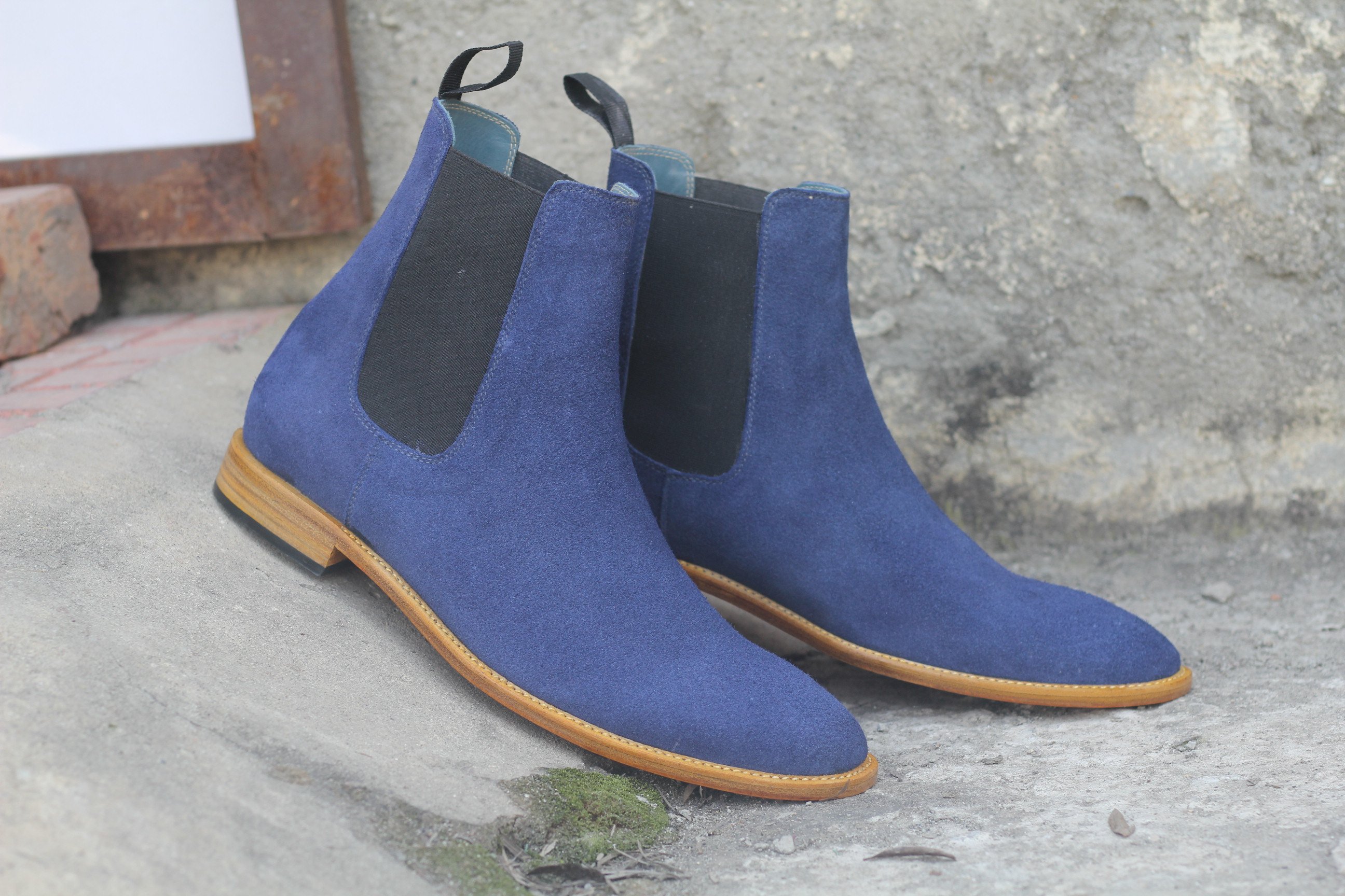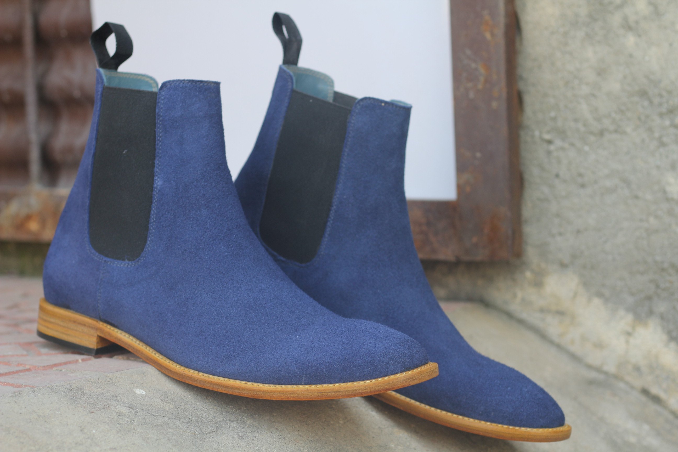 Handmade Blue Ankle High Chelsea Leather Suede Boot