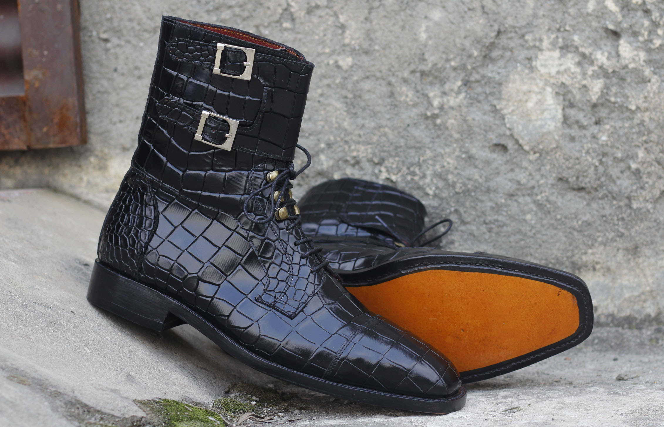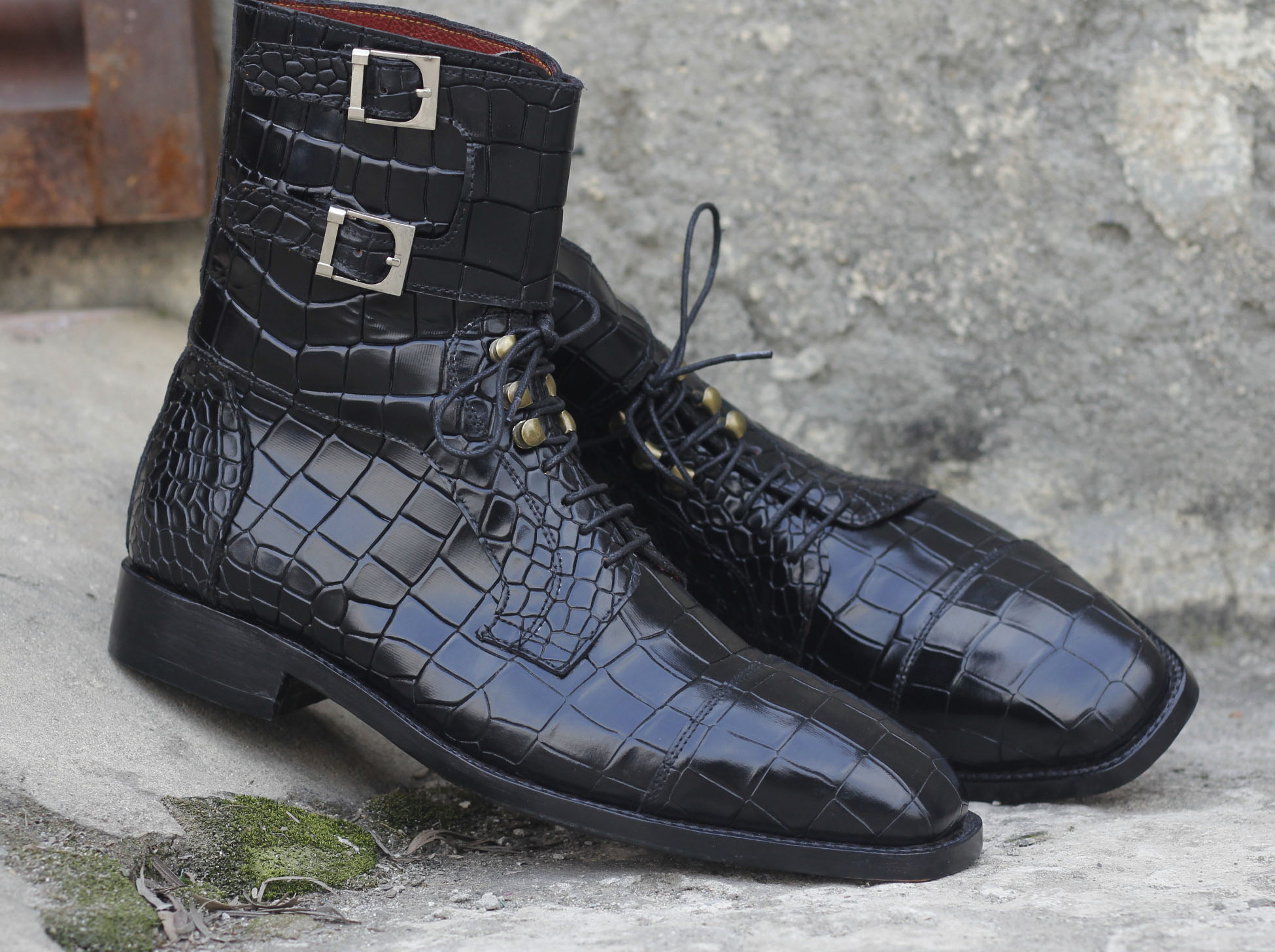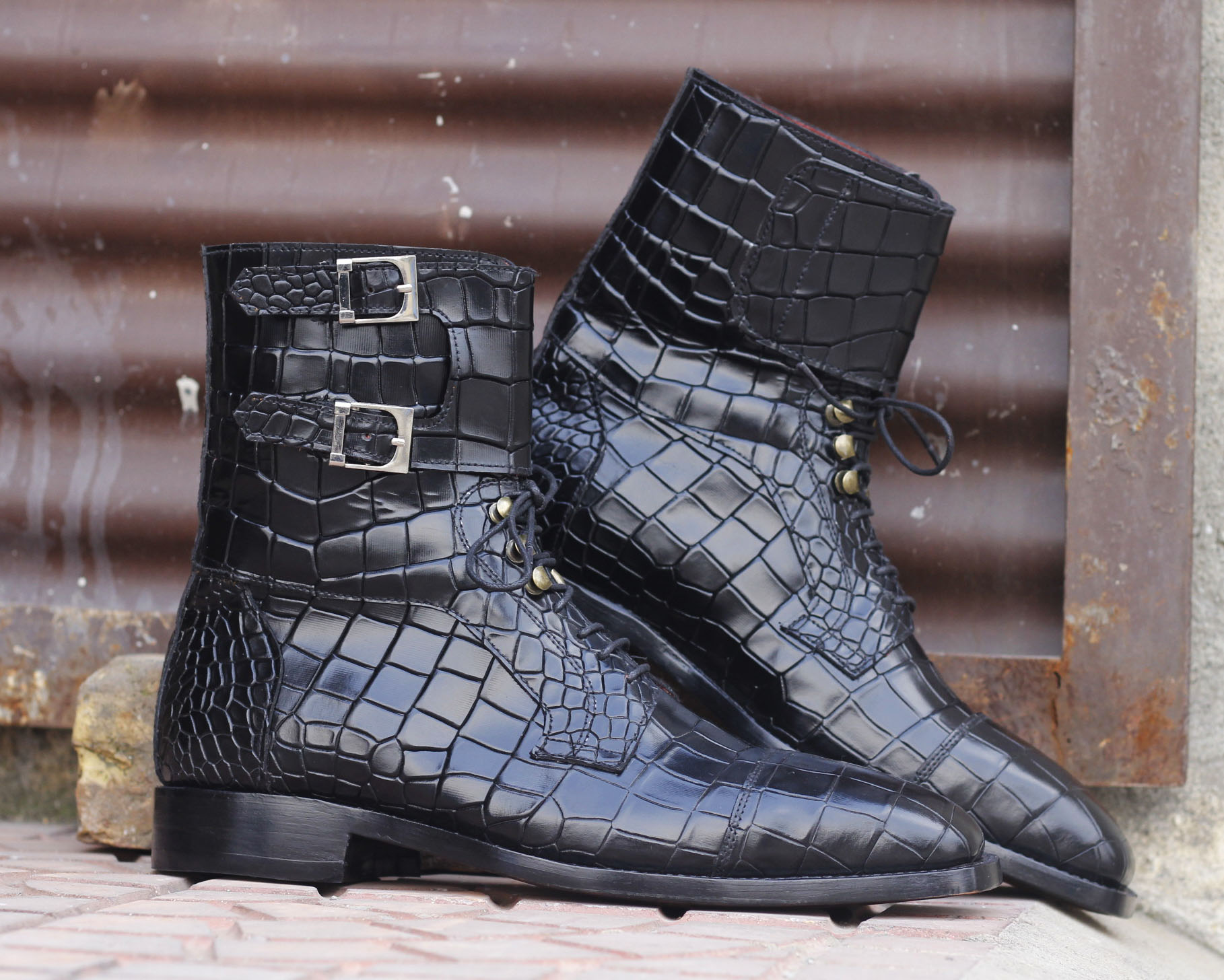Black Alligator Texture Double Monk Lace Up Ankle High Leather Boot