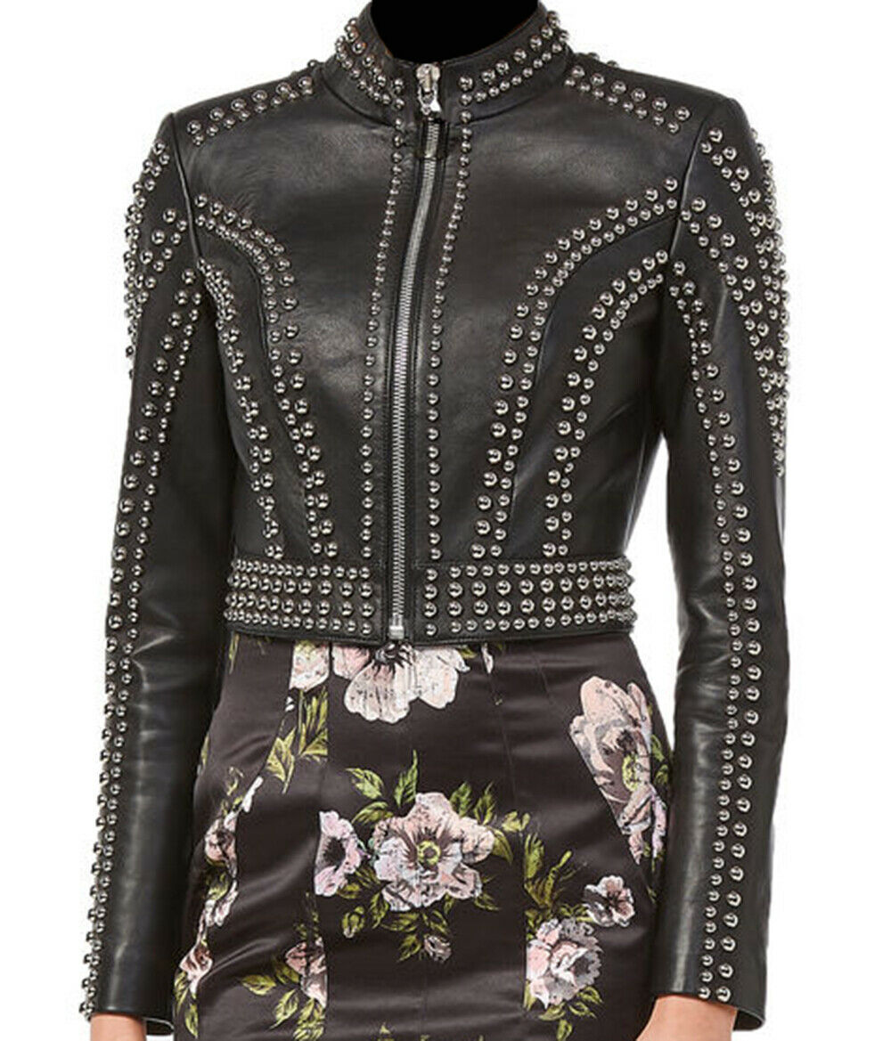 Women Black Silver Studded Punk Vintage Biker Brando Style Leather Jacket