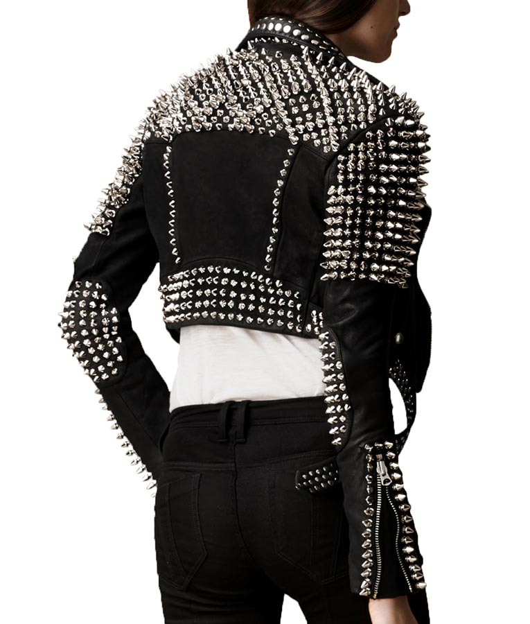 Branded Silver Studded Cropped Leather Jacket For Women With Long Spikes