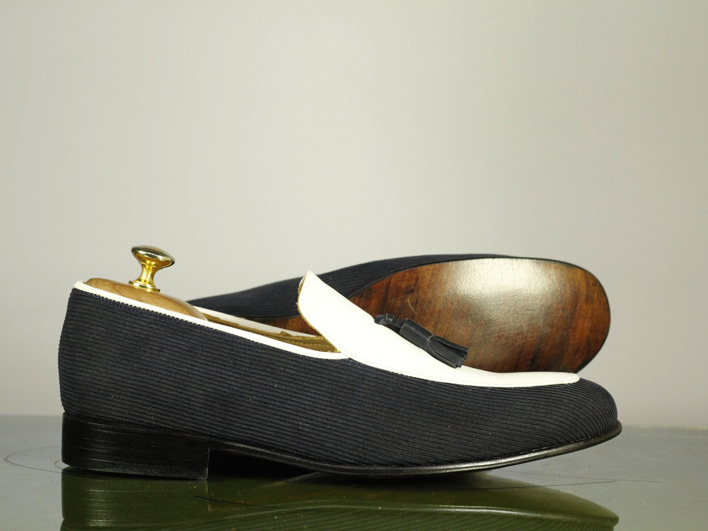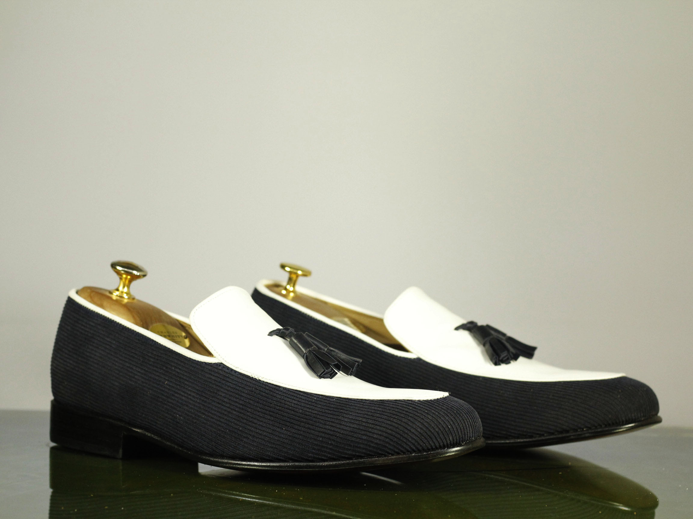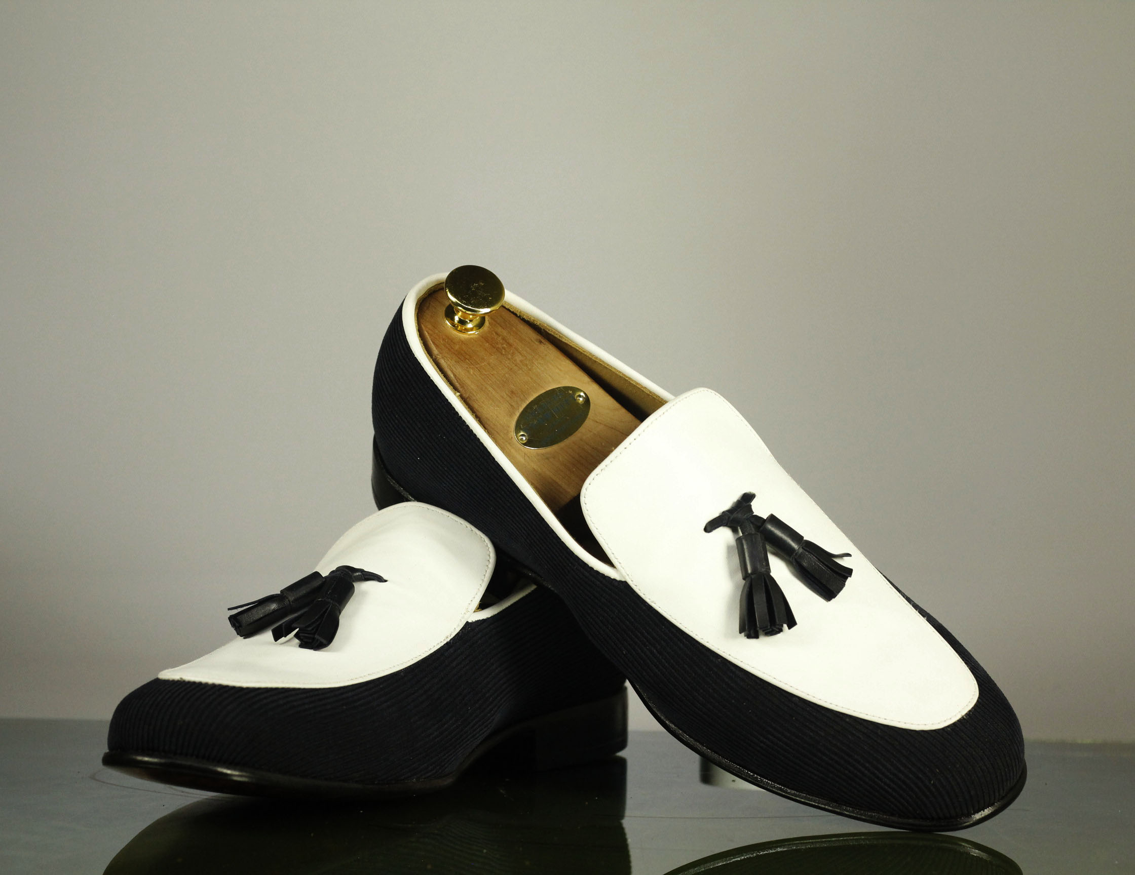 Beautiful Handmade Two Tone Black White Tasseled Leather Suede Loafer