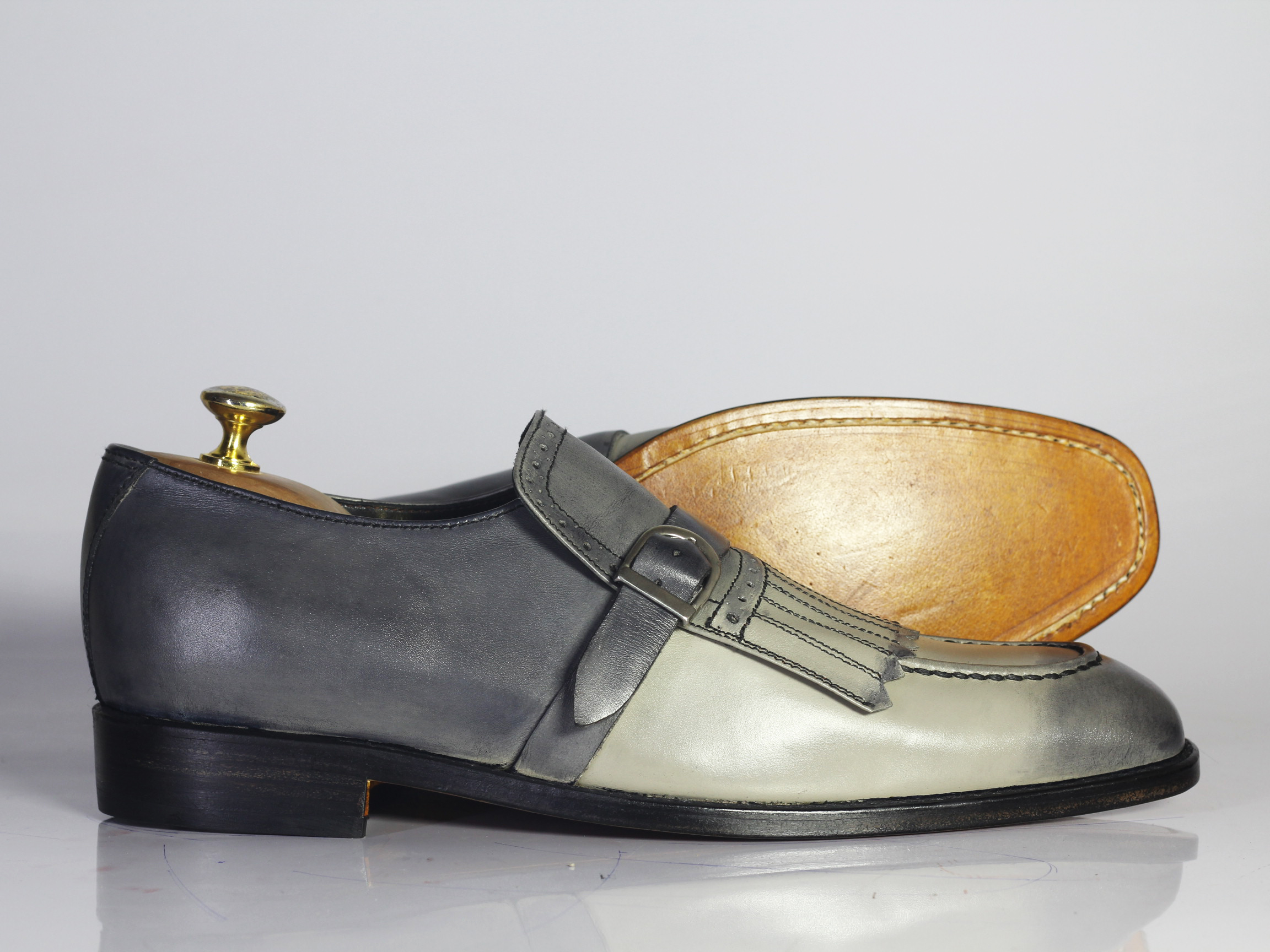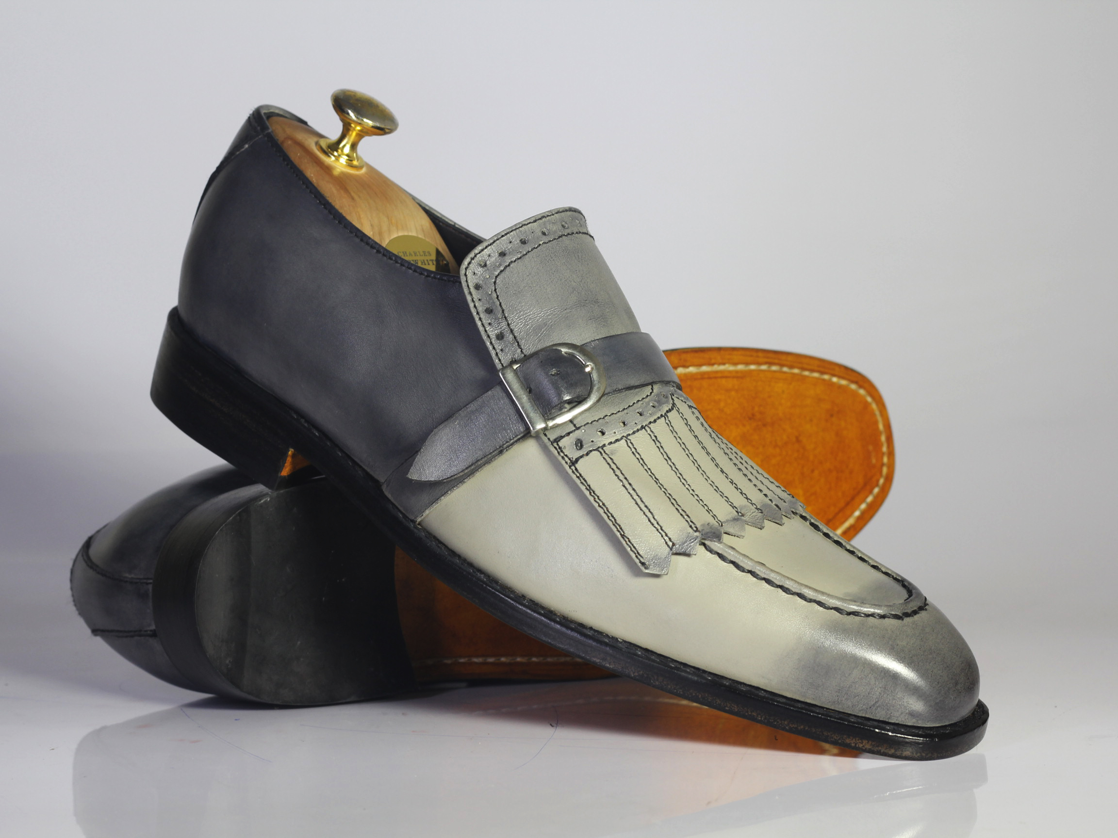 Oxford Two Tone Gray Fringe Buckle Strap Square Toe Leather loafers