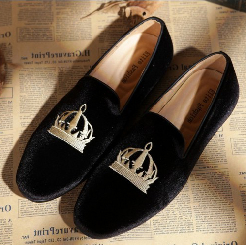 Elegant Velvet Crown Embroidered Slip On Loafer Leather Moccasin