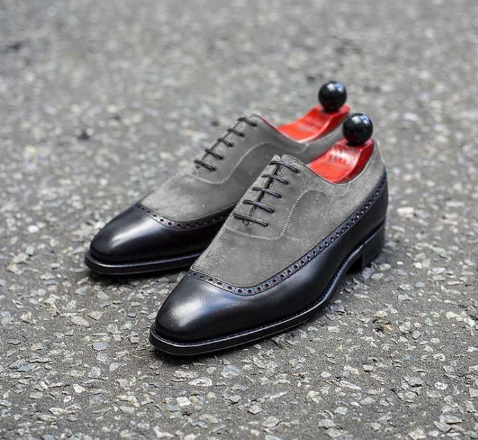 Black Gray Square Toe Brogue Lace Up Leather Suede Shoes