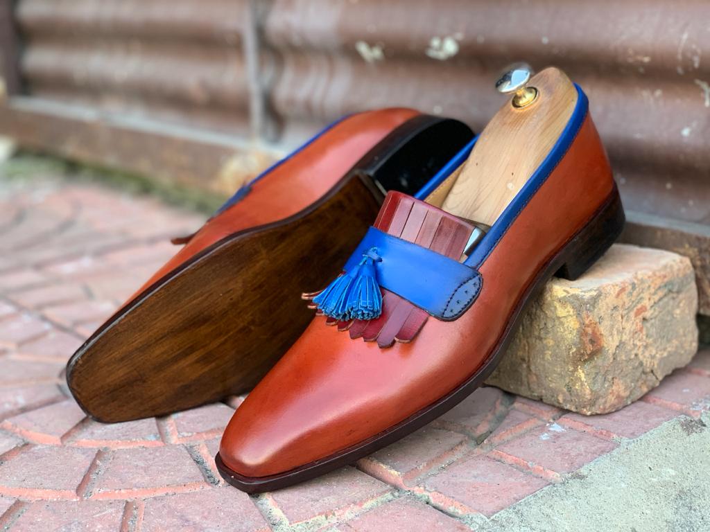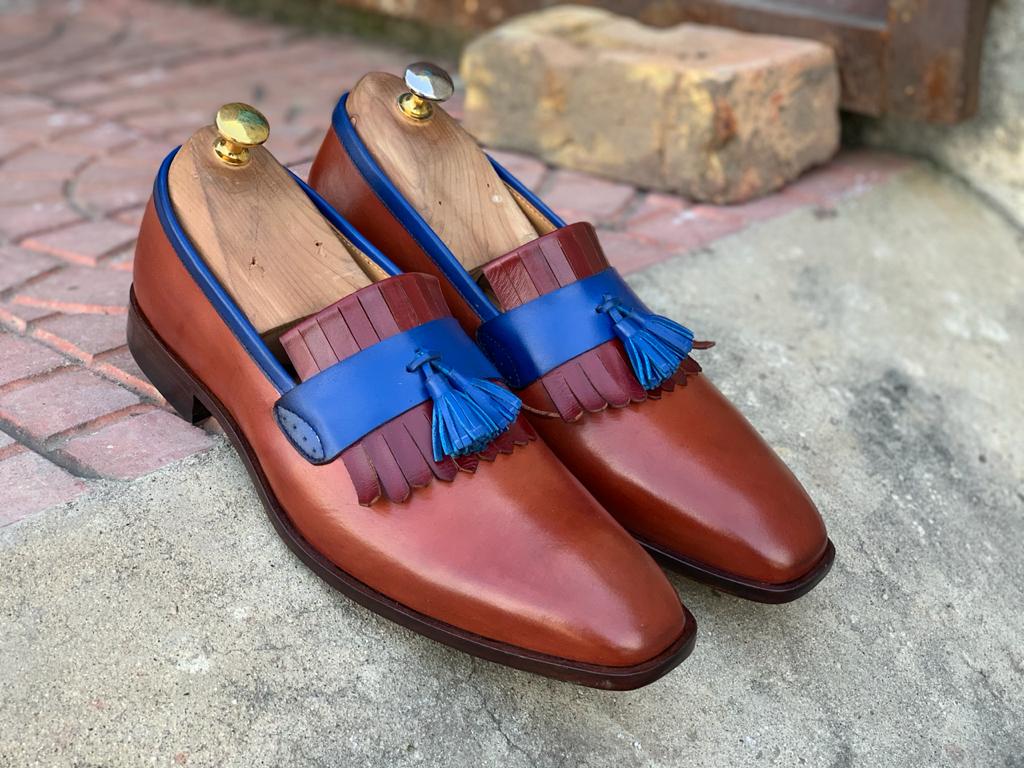 Oxford Tan Blue Fringe Style Leather Slip On Loafers
