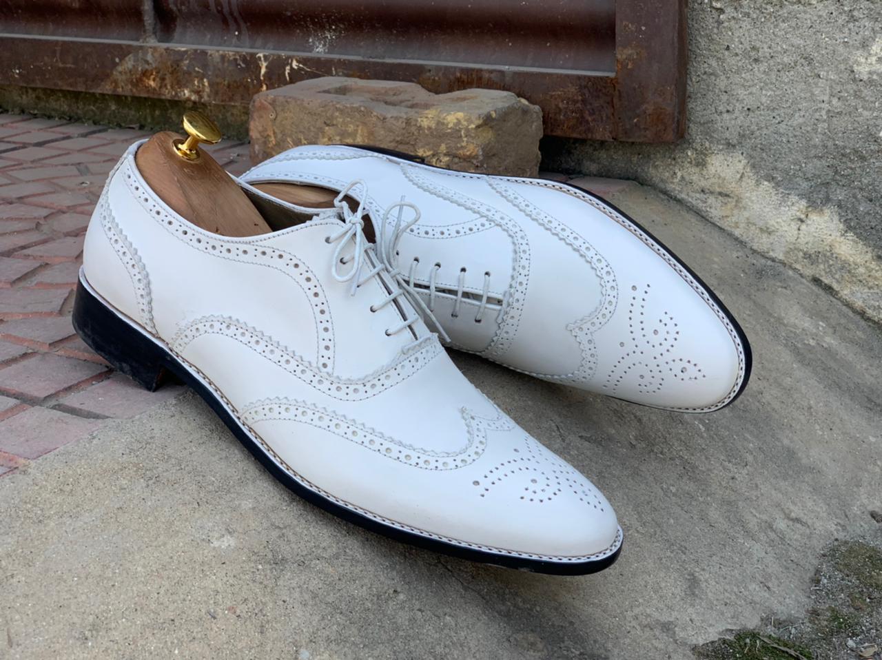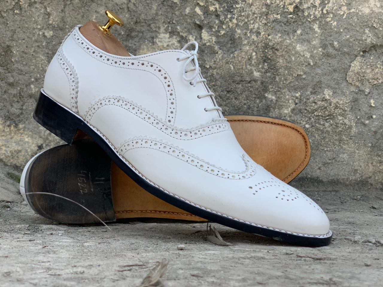 Hand Crafted Wing Tip Pure Leather White Brogue Lace Up Shoes