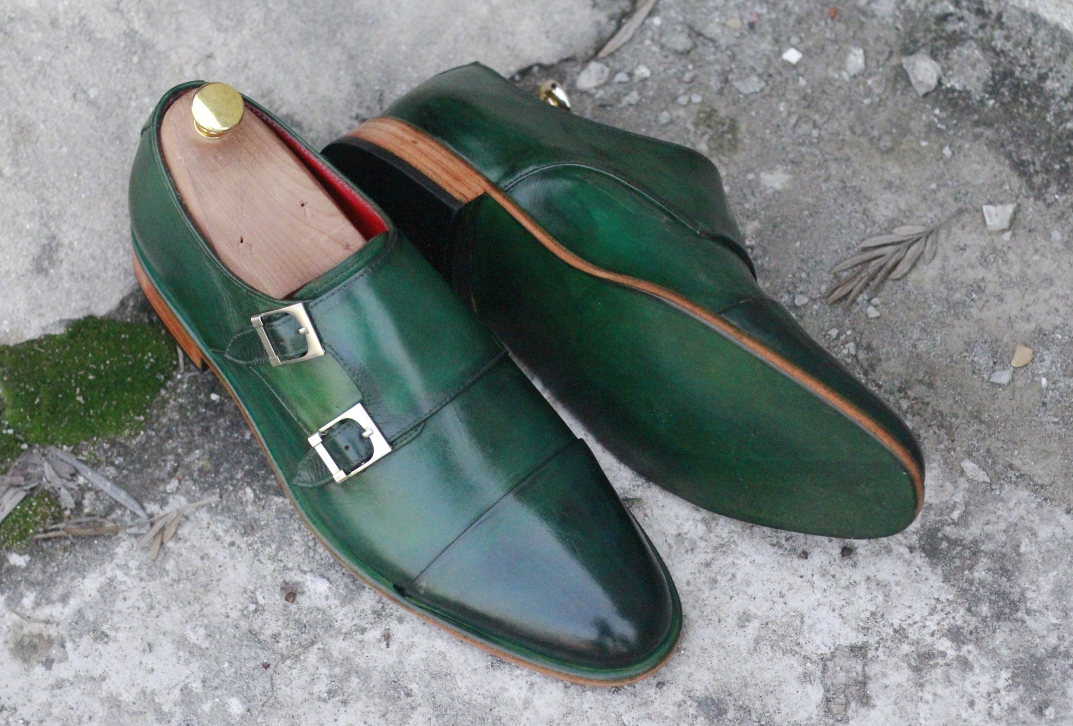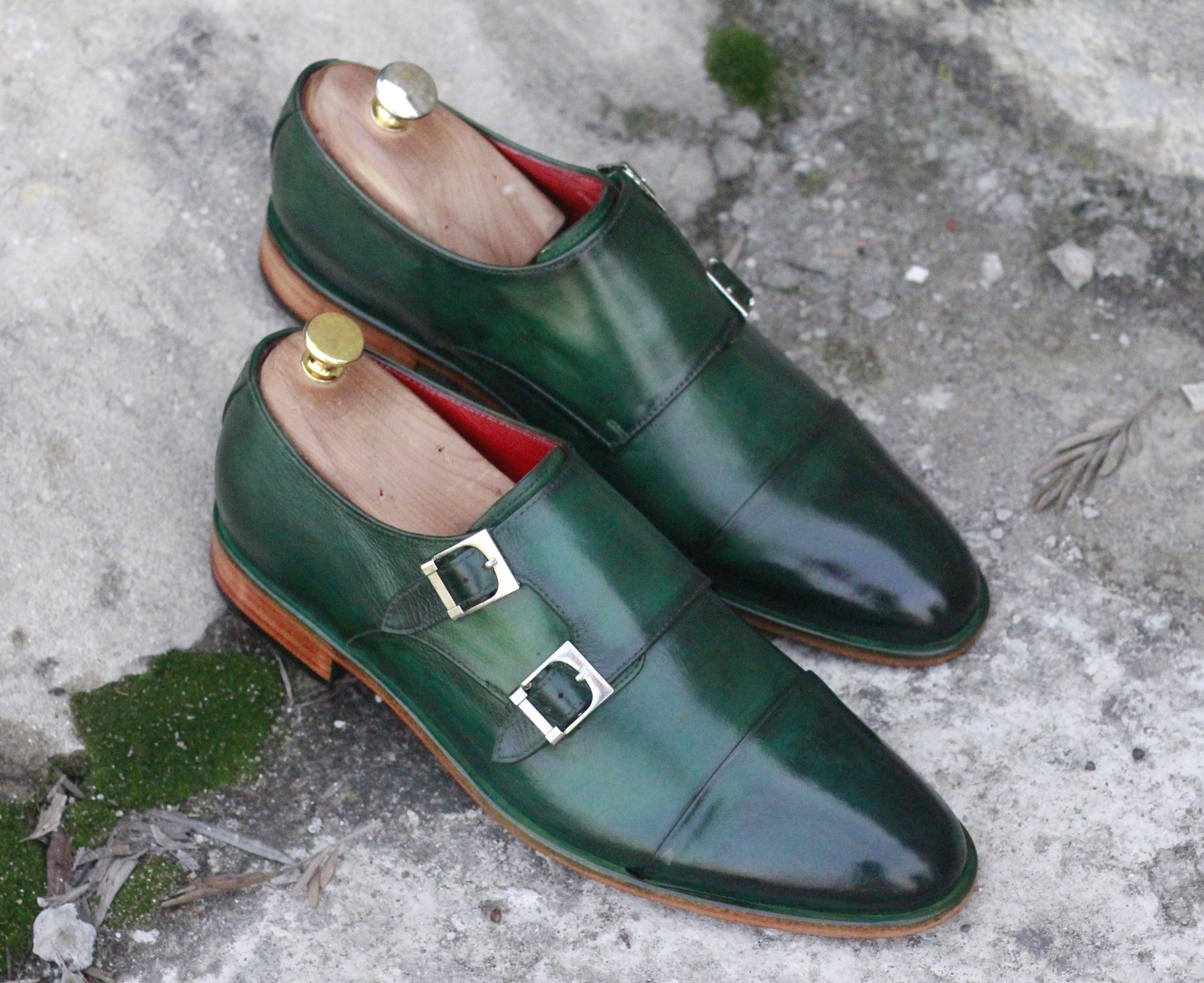 Hand Crafted Cap Toe Bottle Green Double Monk Leather Shoes