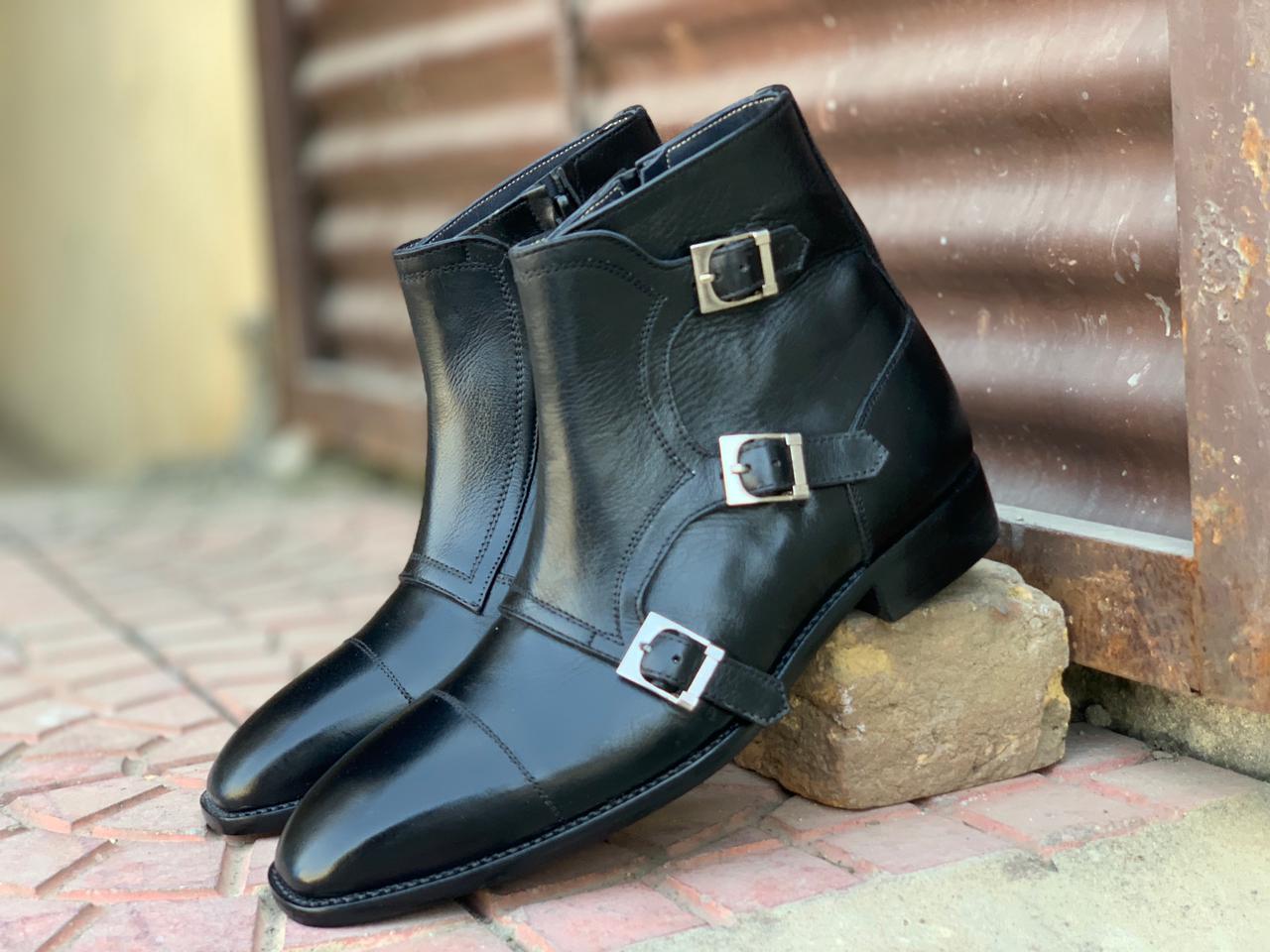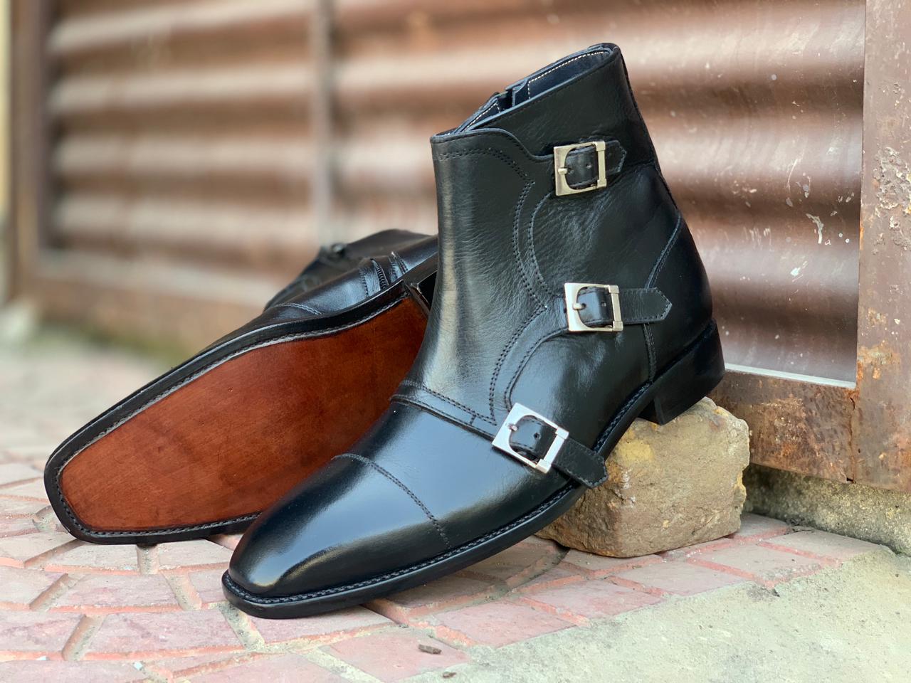 Cap Toe Black Monk Strap Ankle High Leather Long Boot
