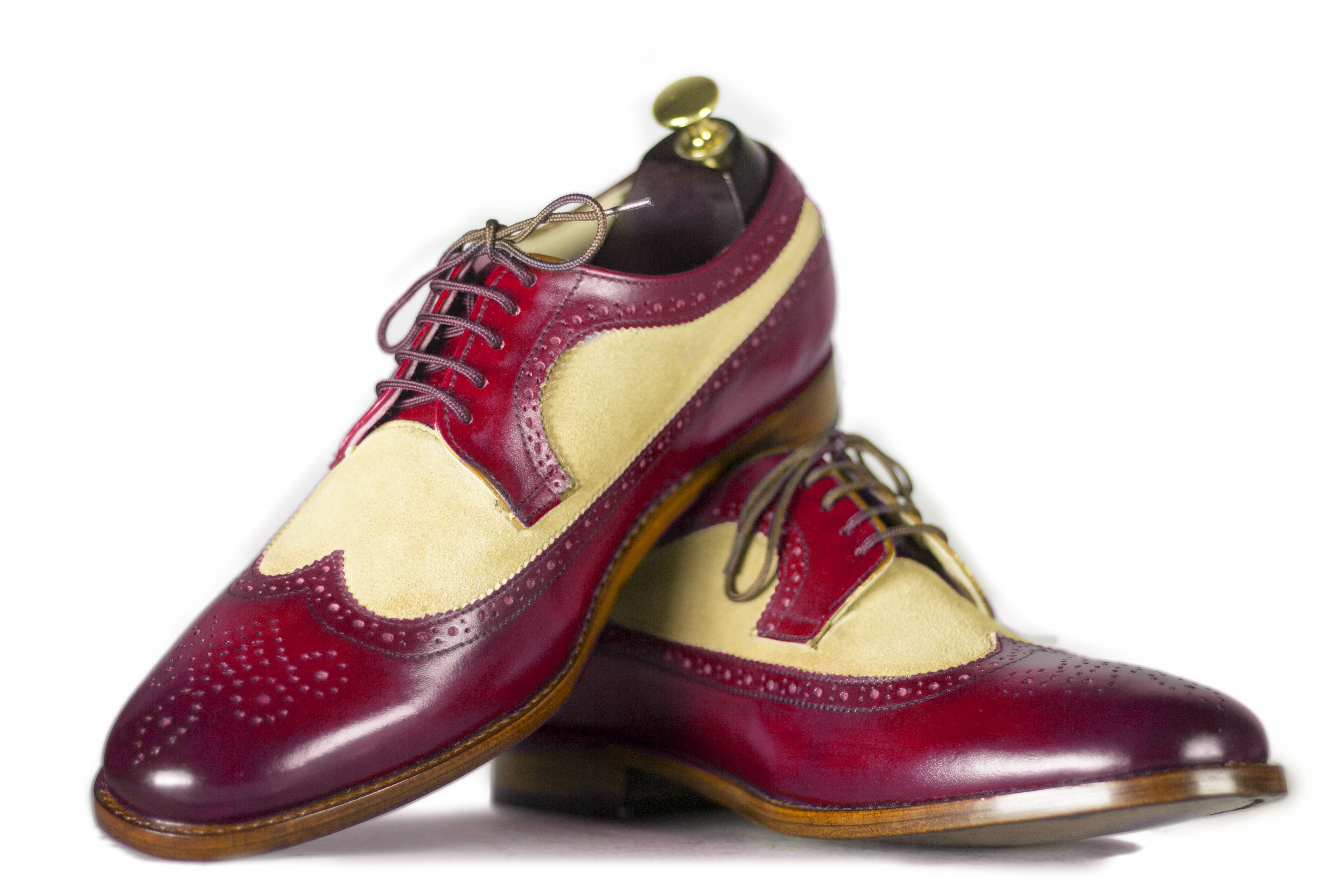 Oxford Wing Tip Burgundy Beige Lace Up Leather Brogue Shoes