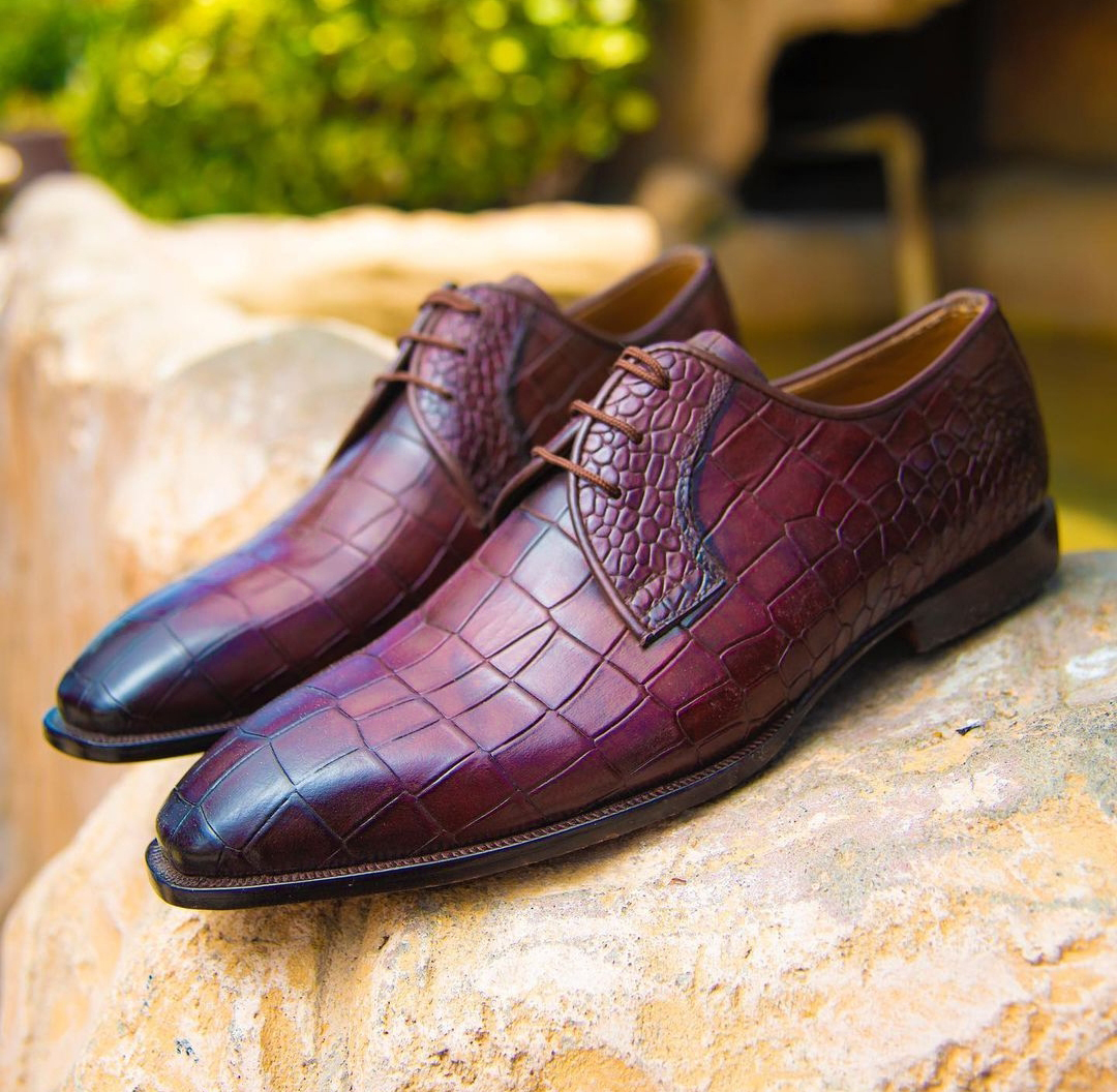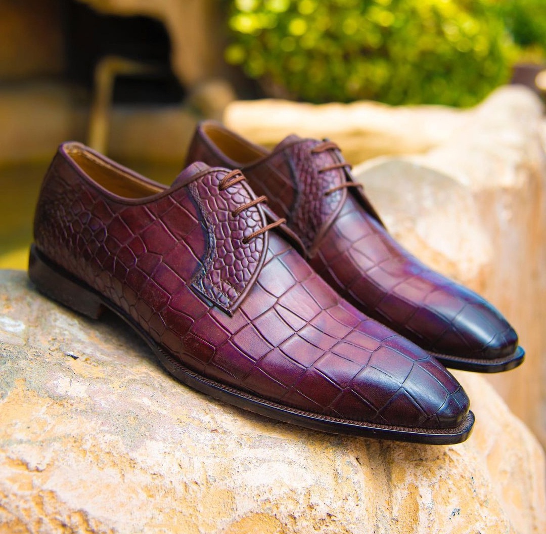 Pointed Toe Alligator Burgundy Leather Lace Up Shoes