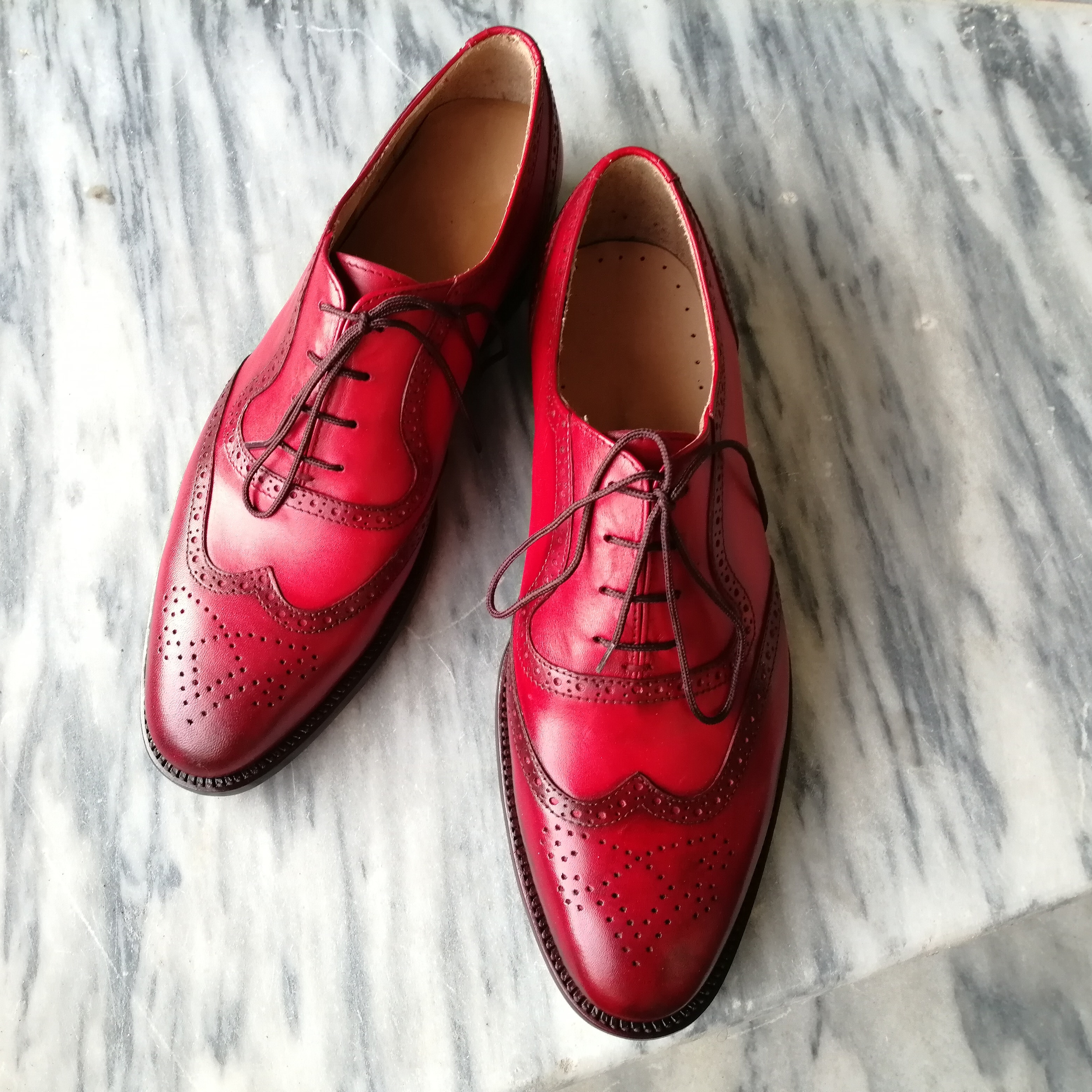 Hand Painted Burgundy Lace Up Wing Tip Leather Shoes