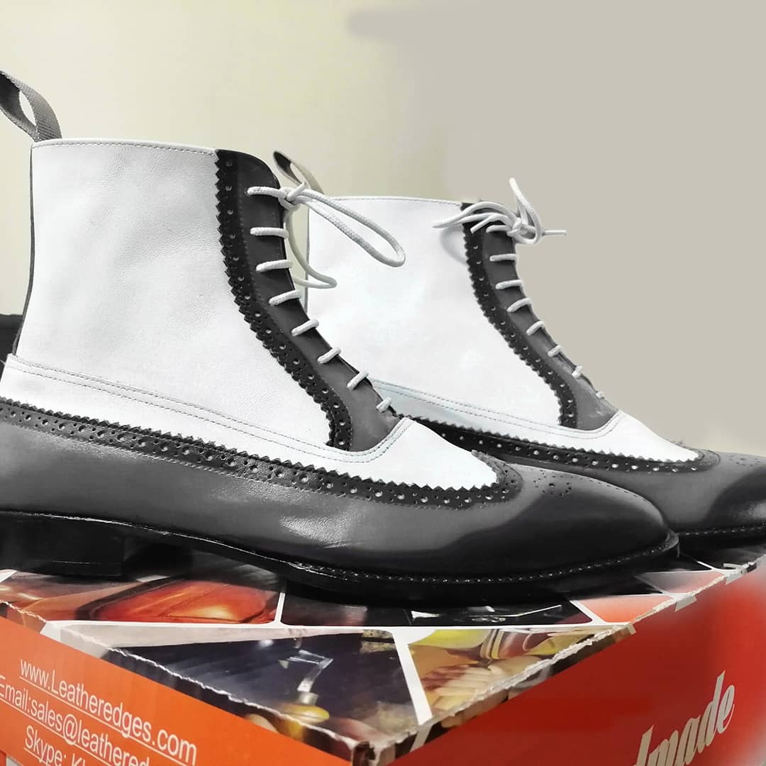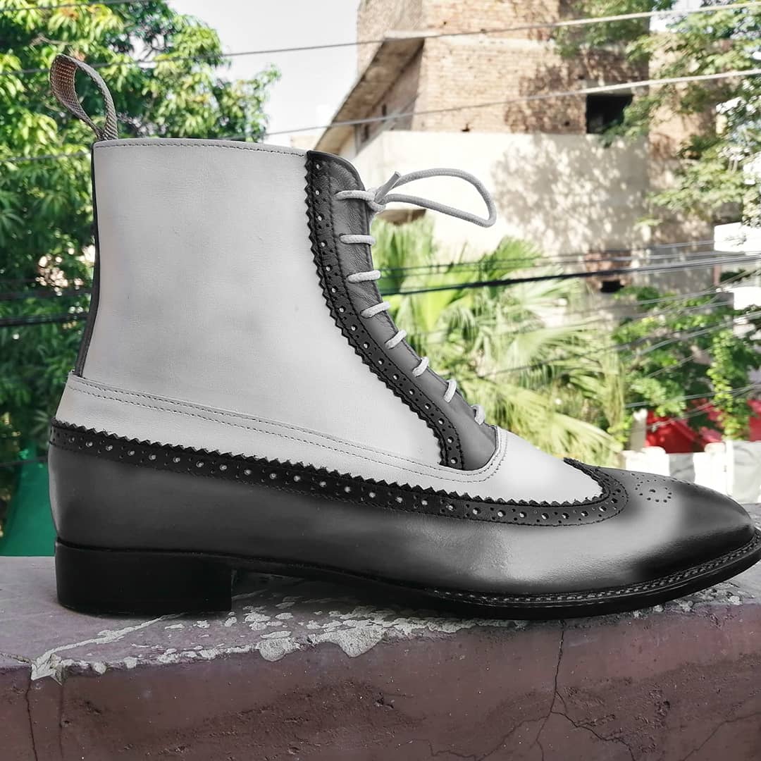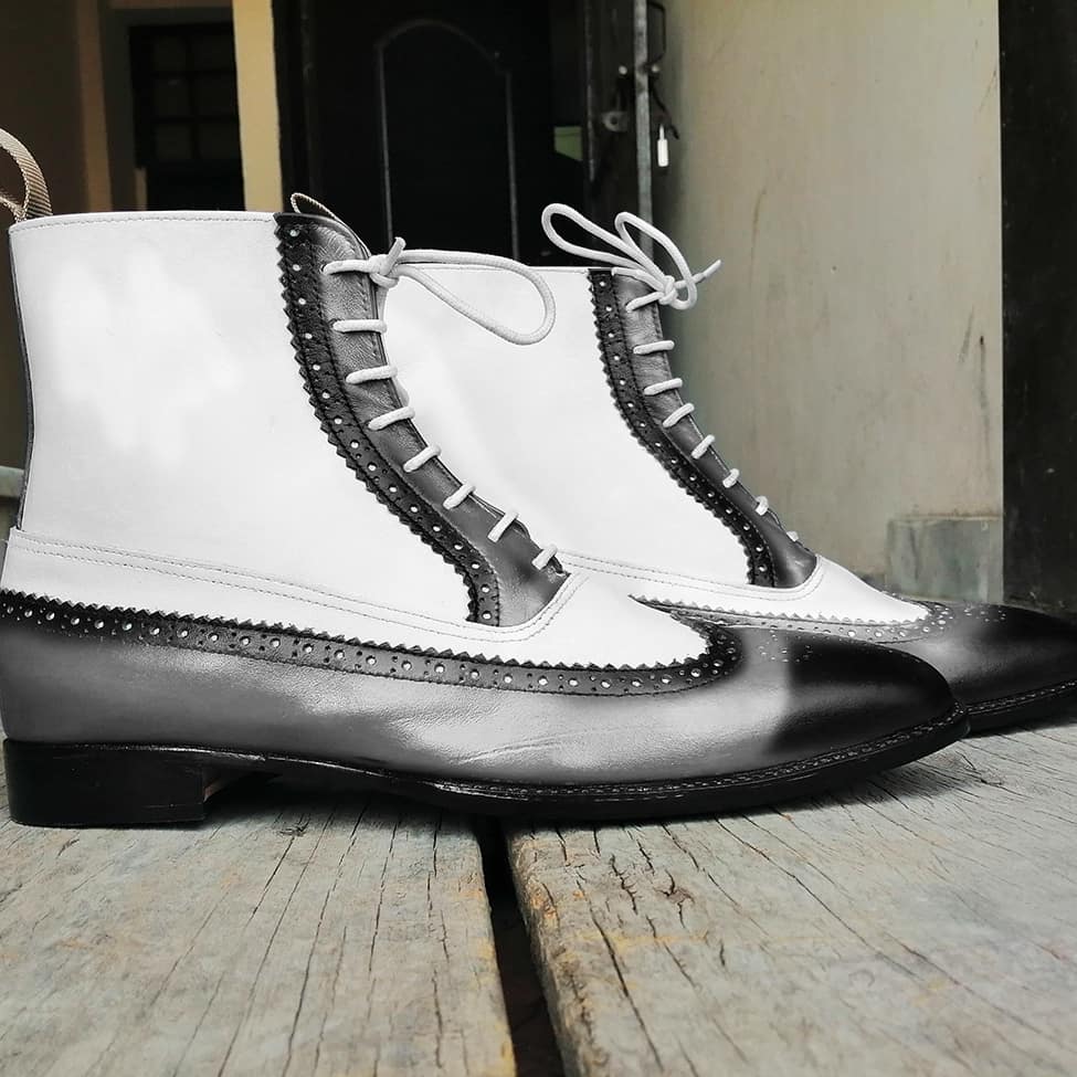Wing Tip White Black Lace Up Ankle High Leather Boot