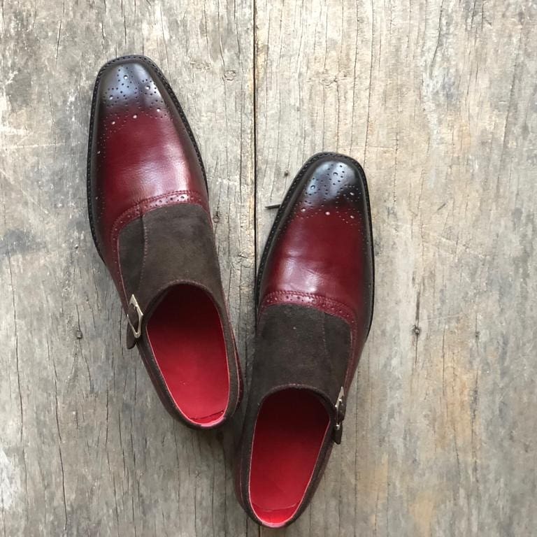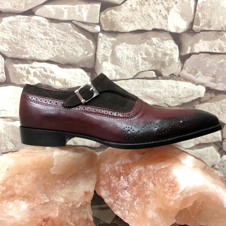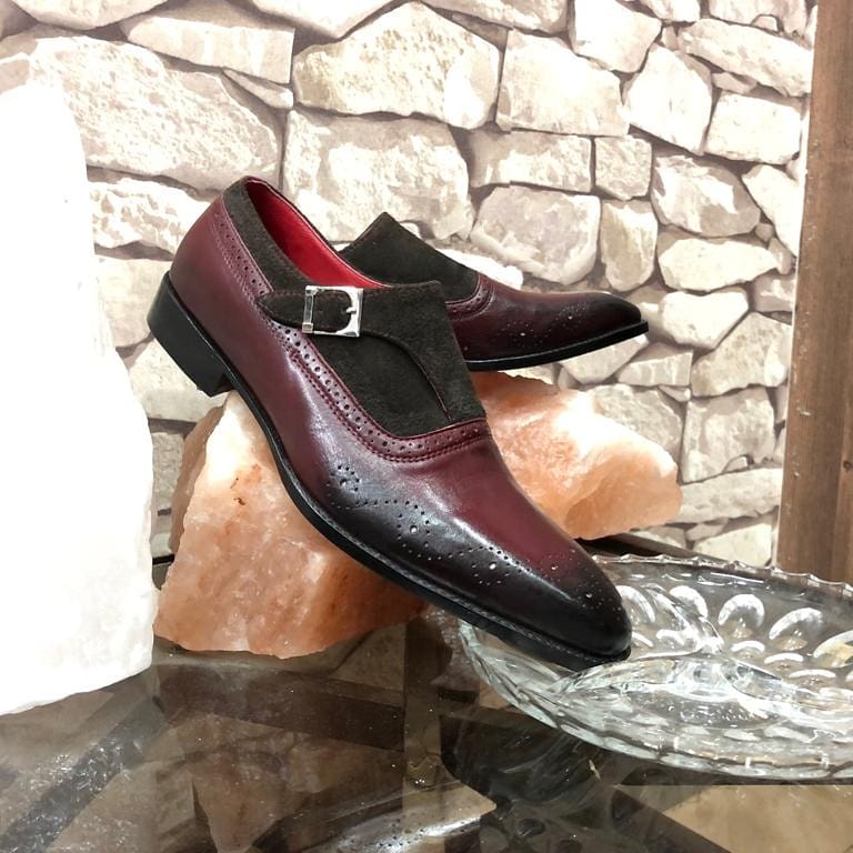 Oxford Side Buckle Burgundy Leather Suede Brogue Shoes