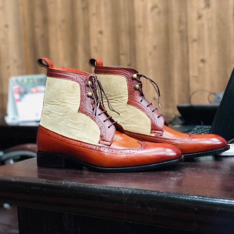 Hand Painted Wing Tip Ankle High Two Tone Leather Boot