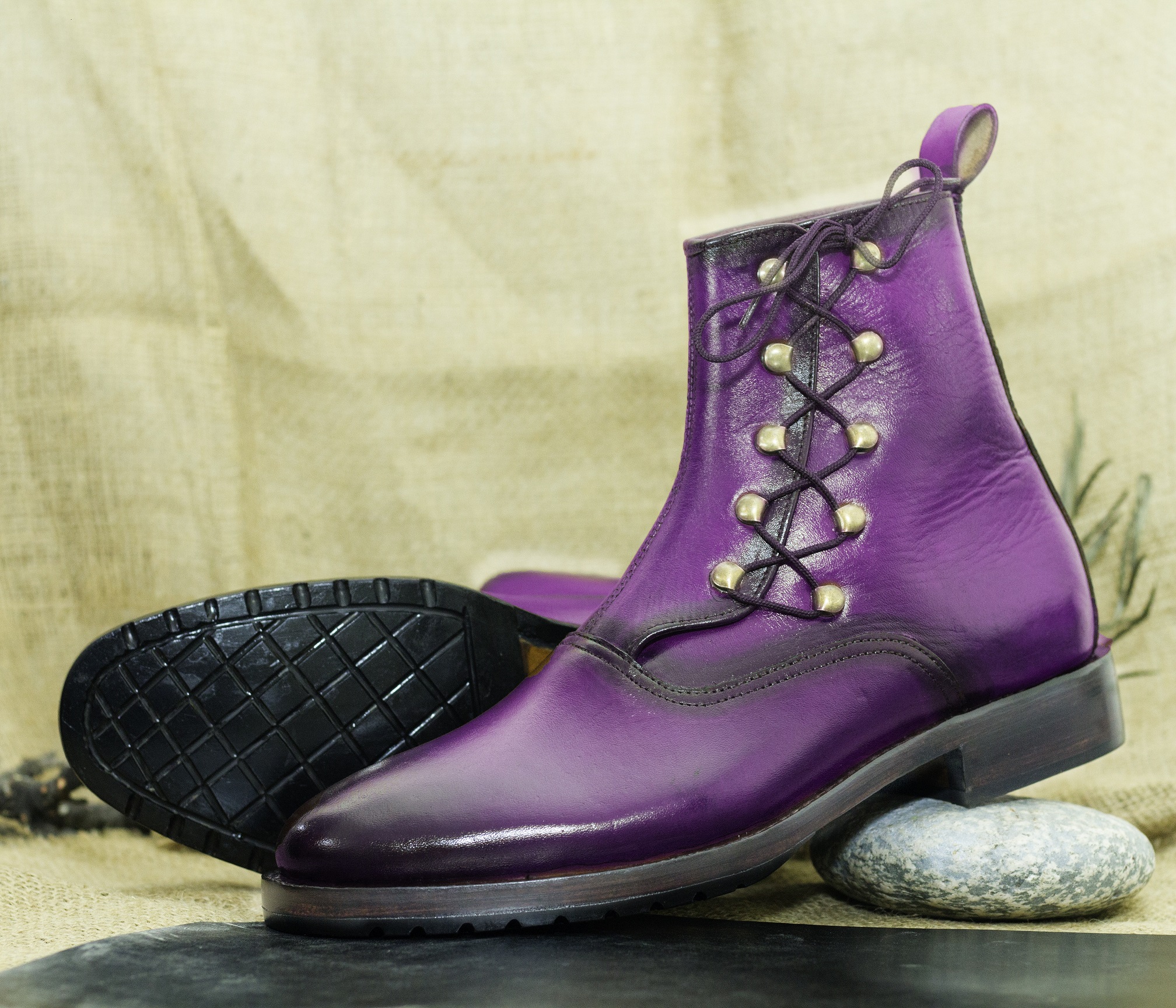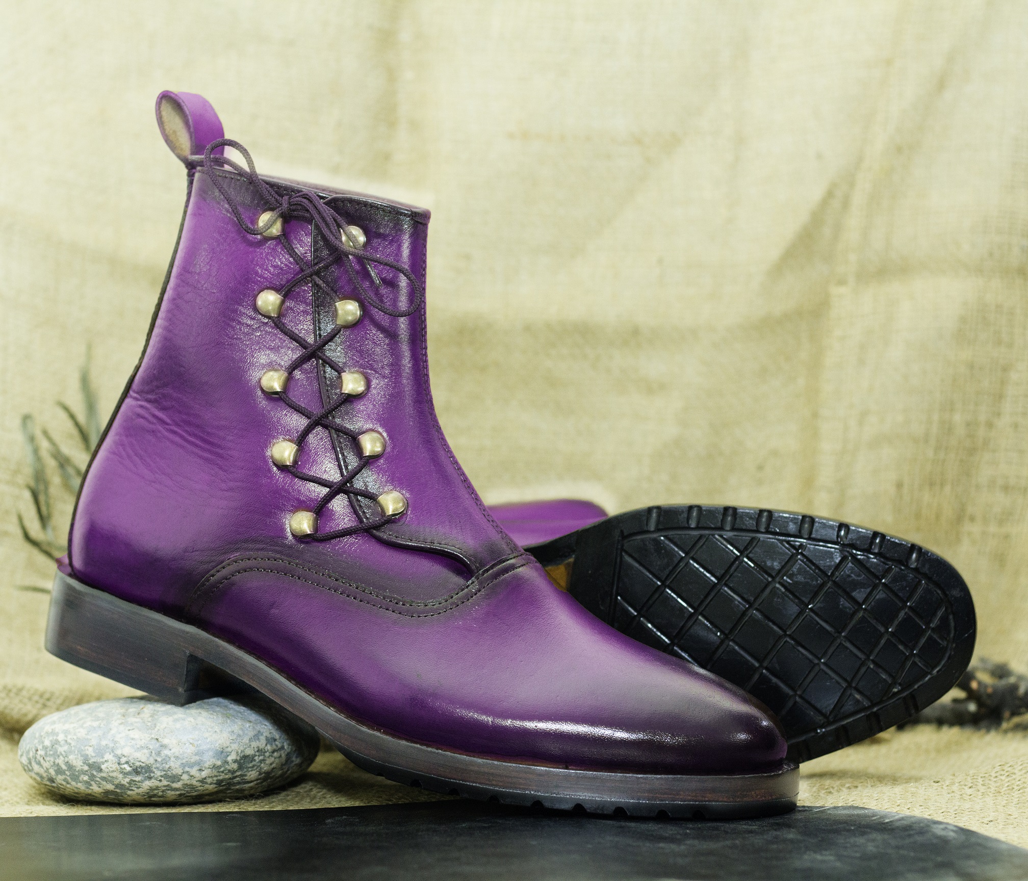 Side Lace Up Ankle High Purple Leather Men's Boot