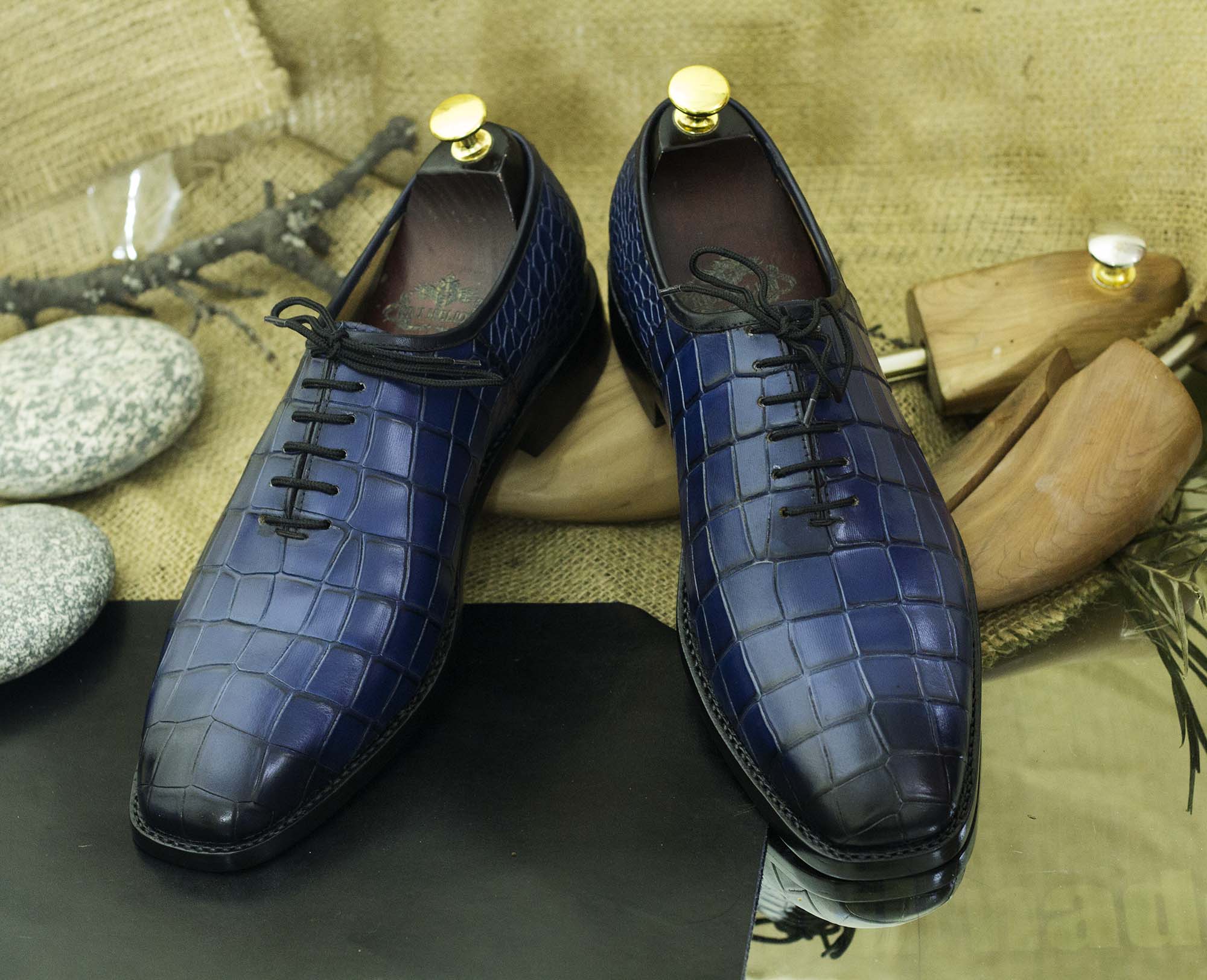 Blue Alligator Texture Leather Lace Up Handmade Men's Shoes