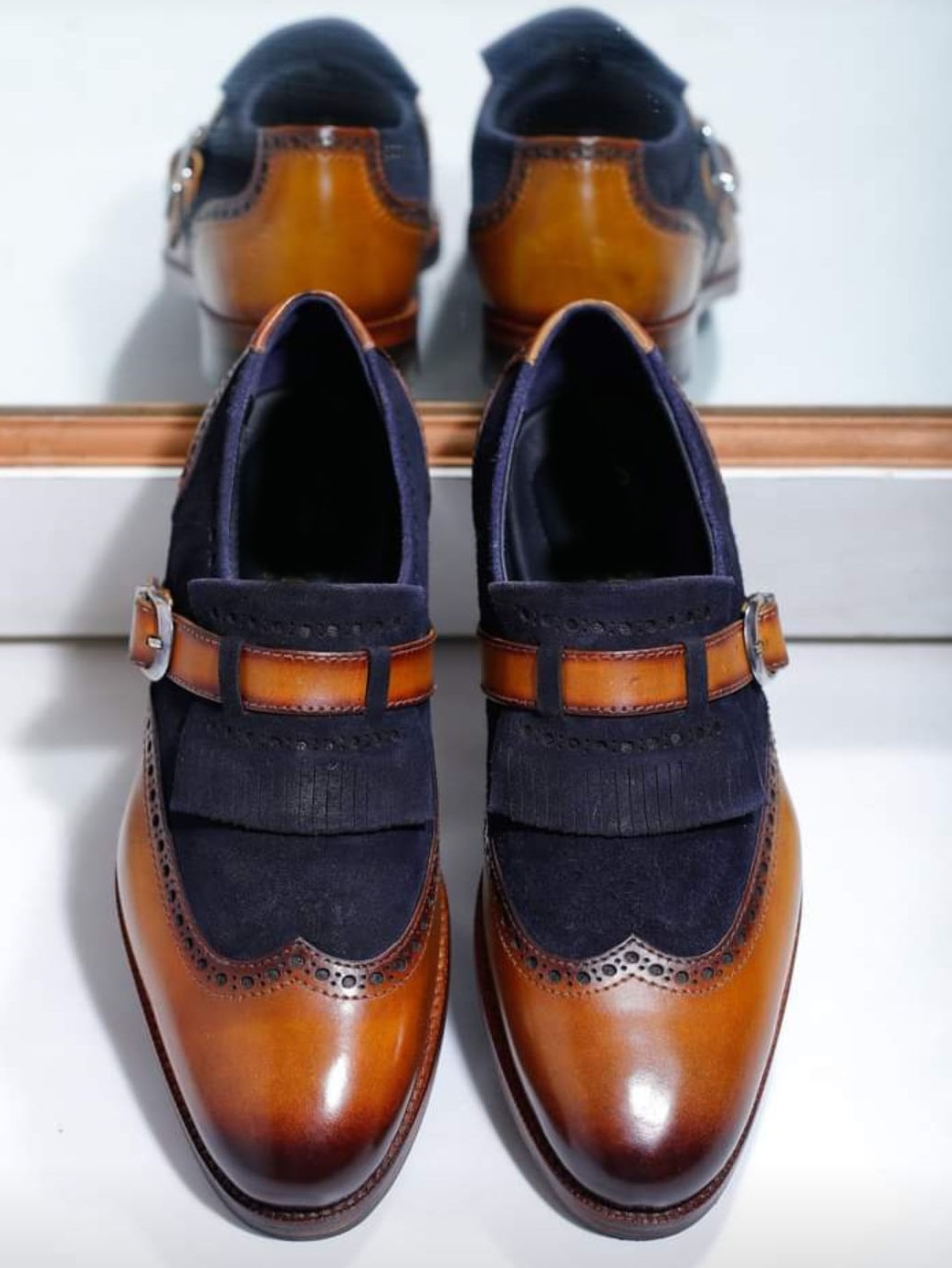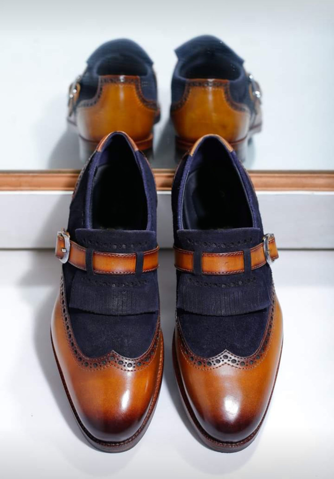Wing Tip Handmade Two Tone Fringe Side Buckle Leather Suede Loafers