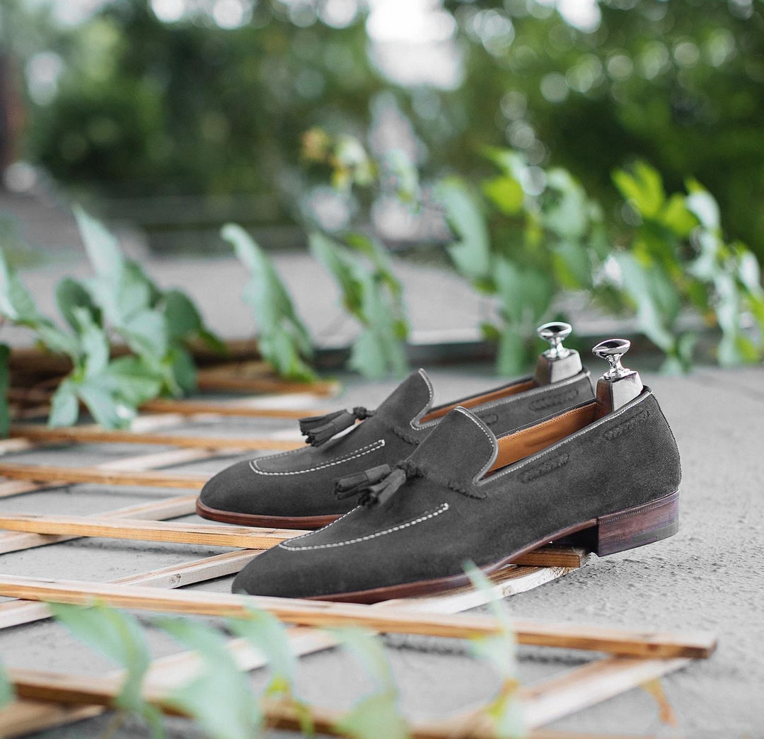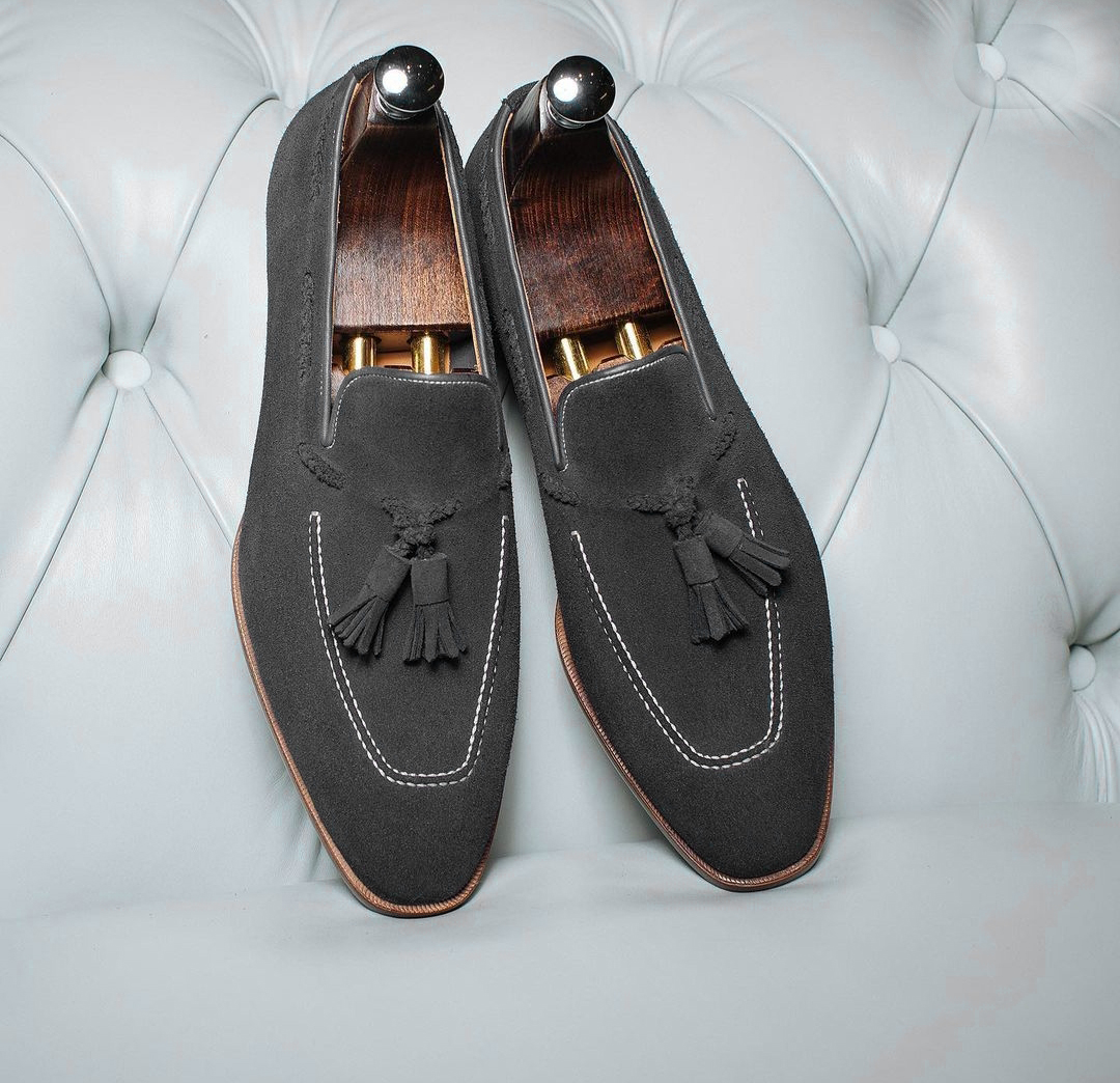 Hand Crafted Tasseled Gray Slip On Moccasin Leather Suede Loafers