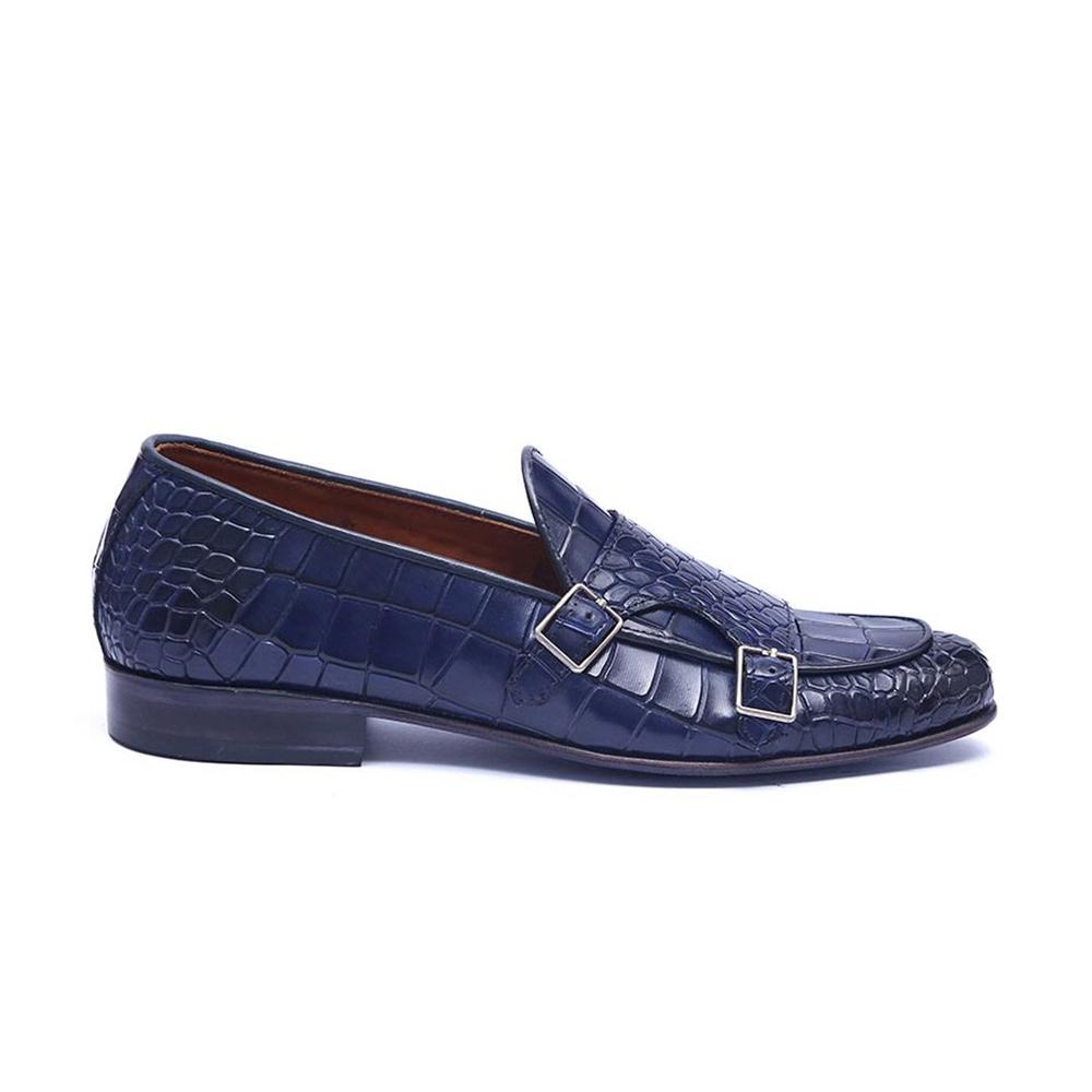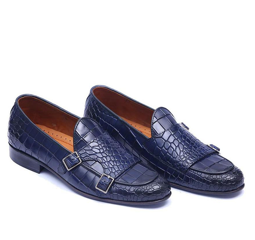 Handmade Double Monk Blue Alligator Texture Leather Shoes