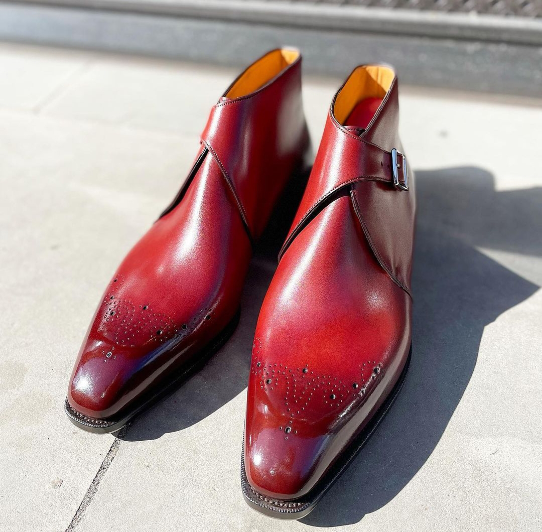 Hand Painted Half Ankle Burgundy Buckle Strap Brogue Leather Boot