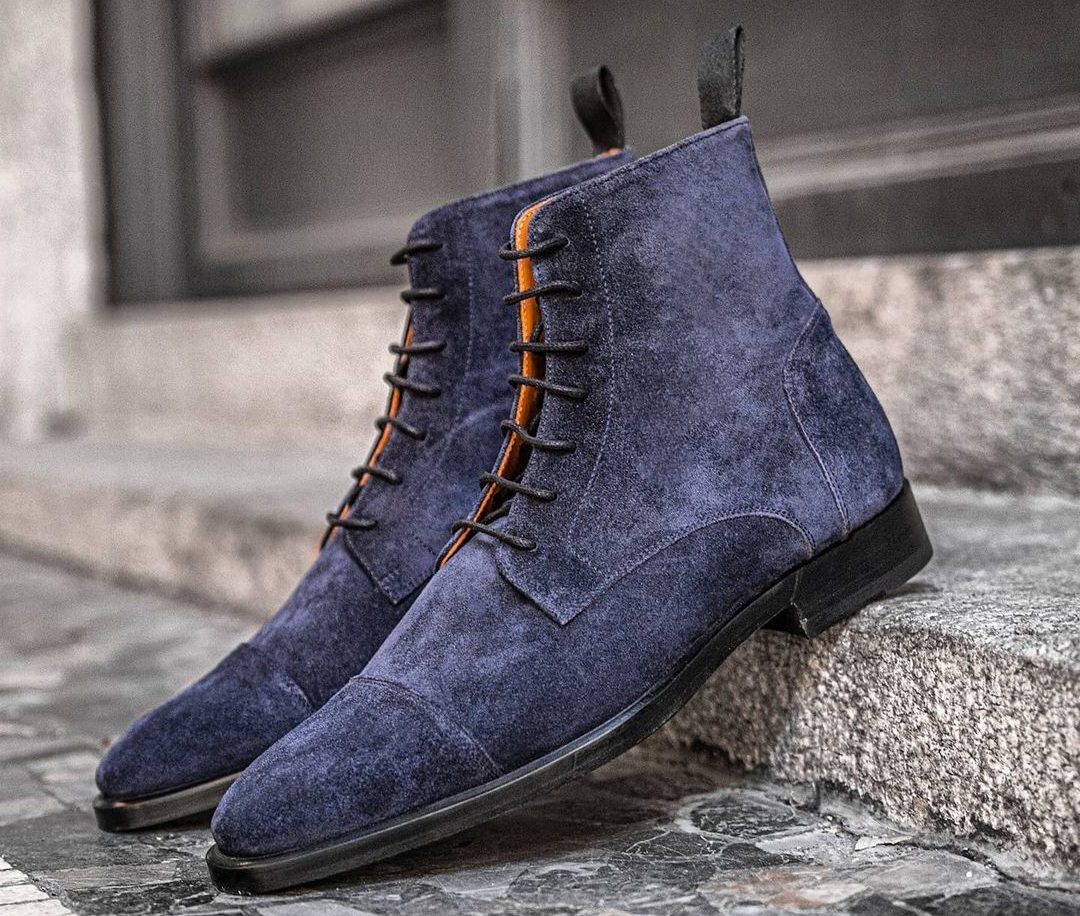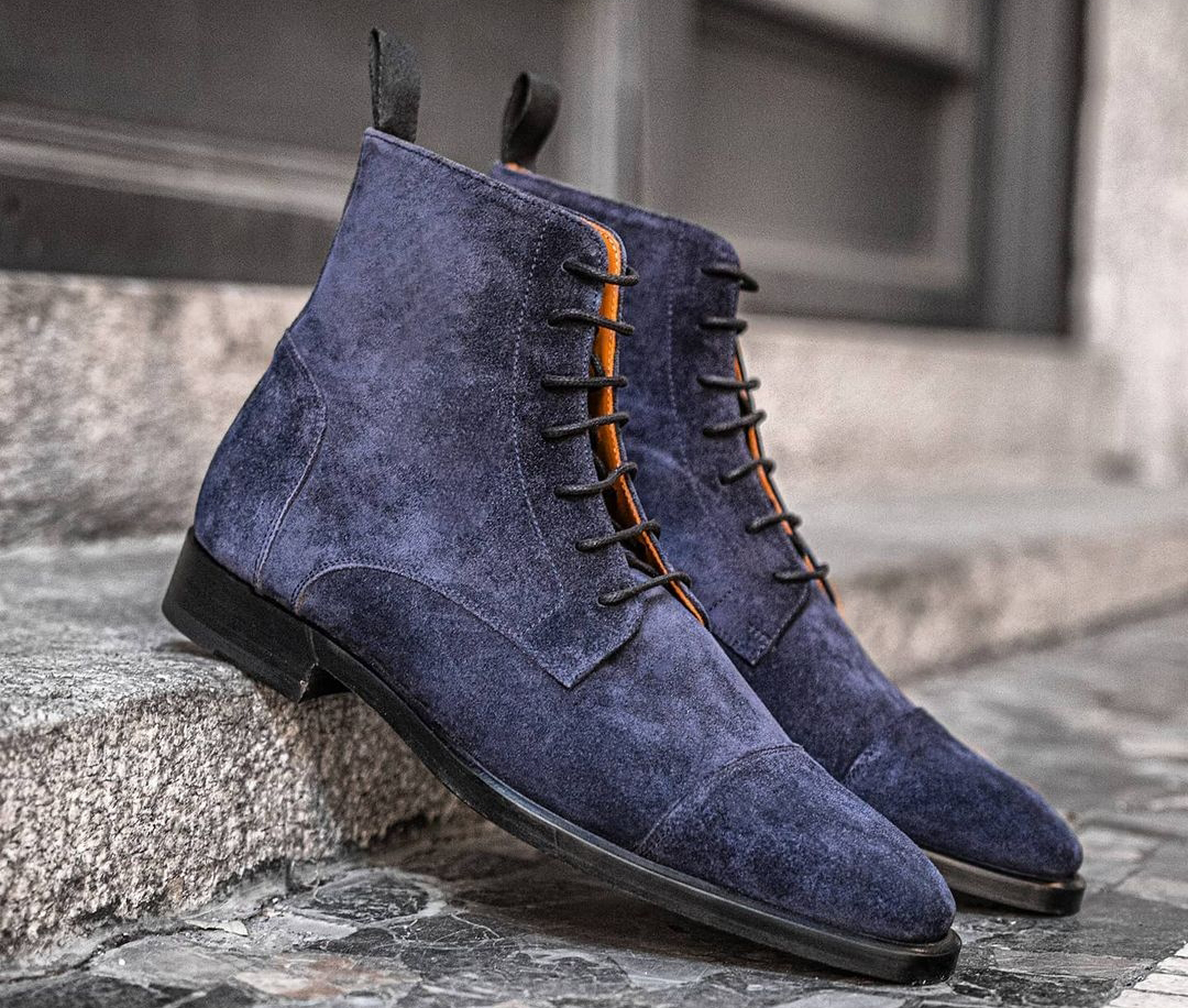 Handmade Cap Toe Navy Blue Leather Suede Lace Up Boot