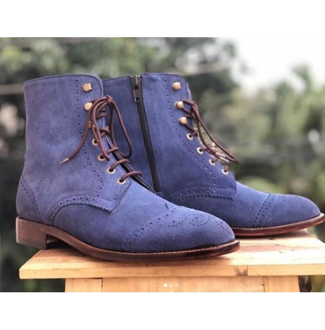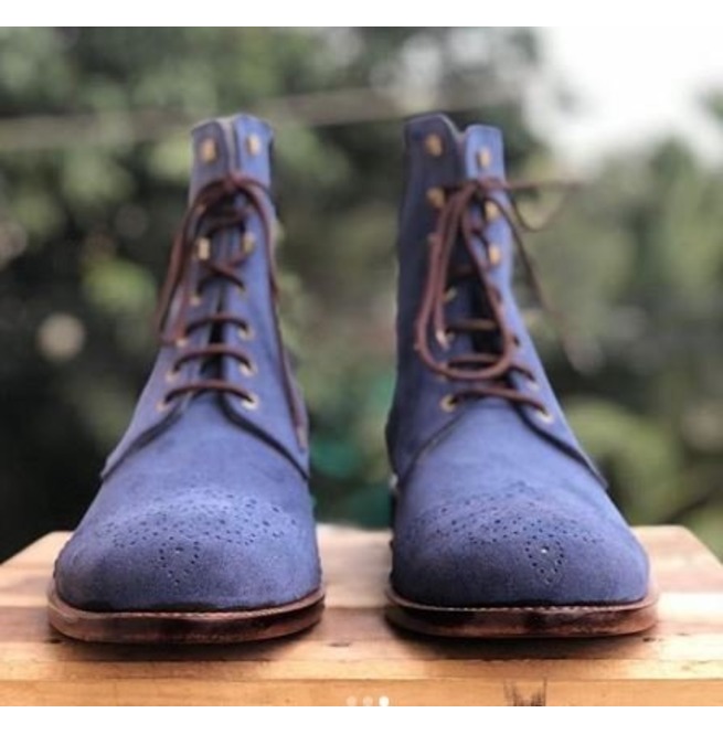 Men’s Brogue Lace Up Blue Suede High Ankle Cap Toe Boots