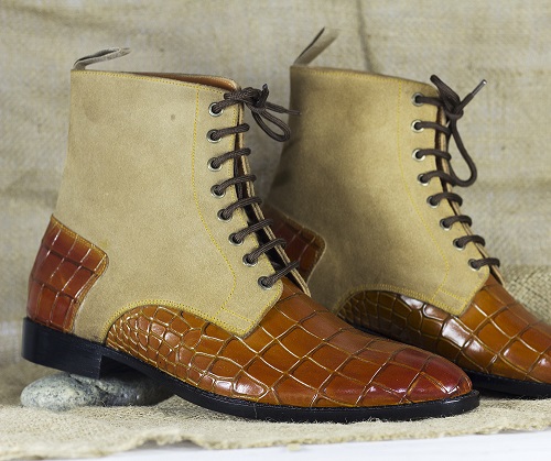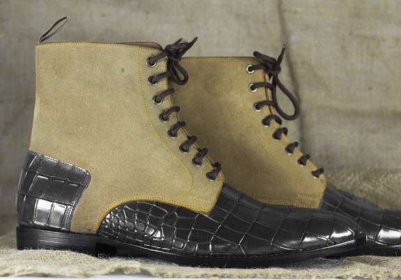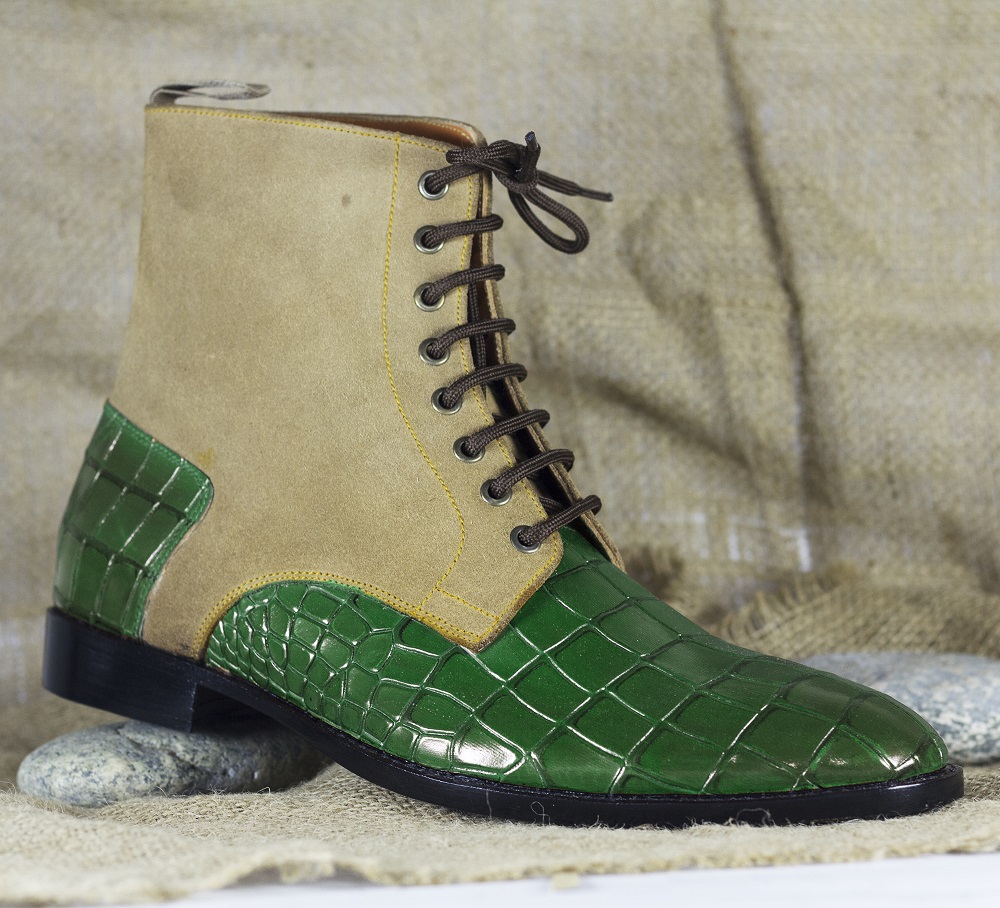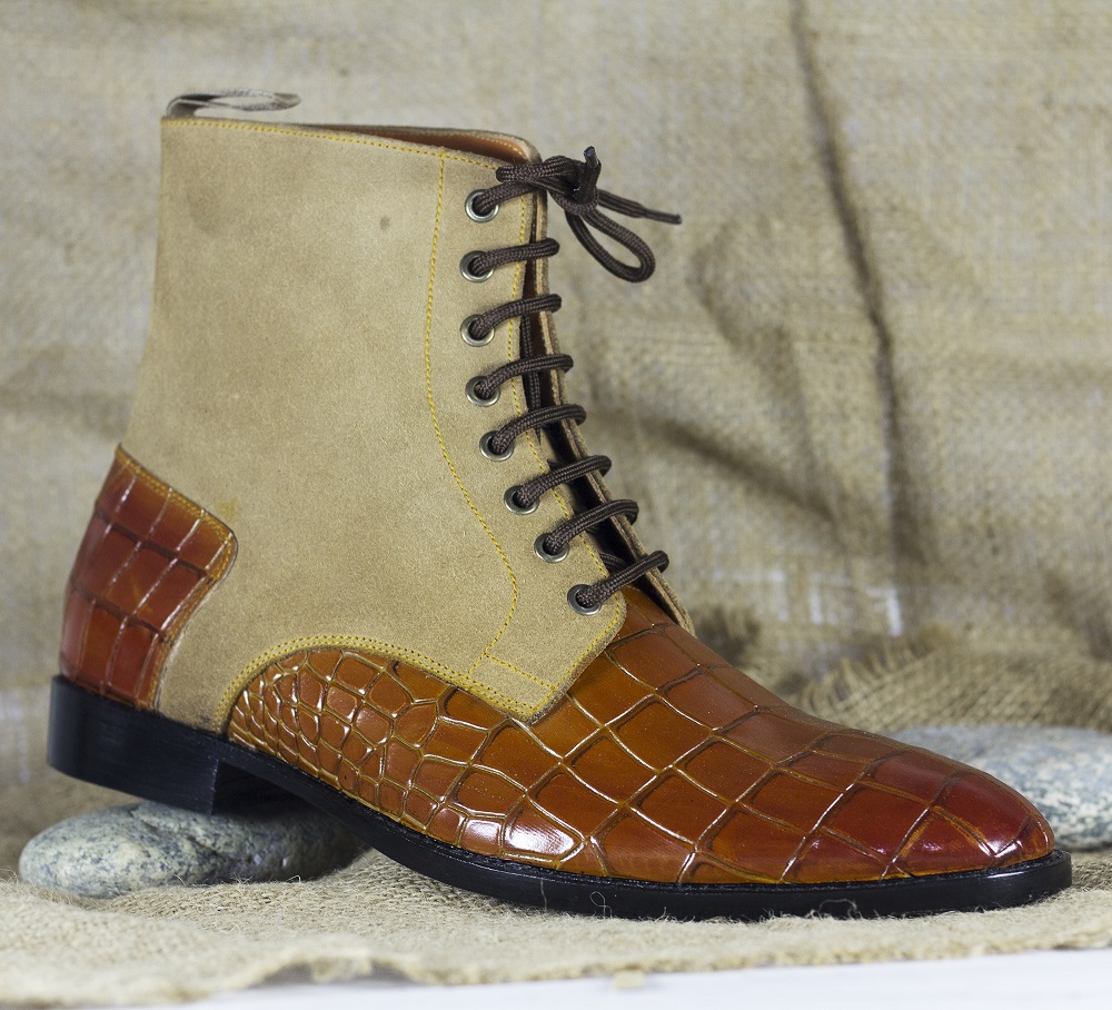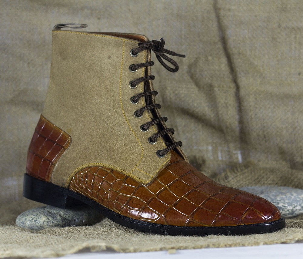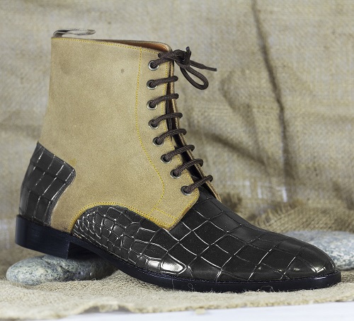 Handmade Ankle High Two Tone Alligator Texture Leather Suede Boot