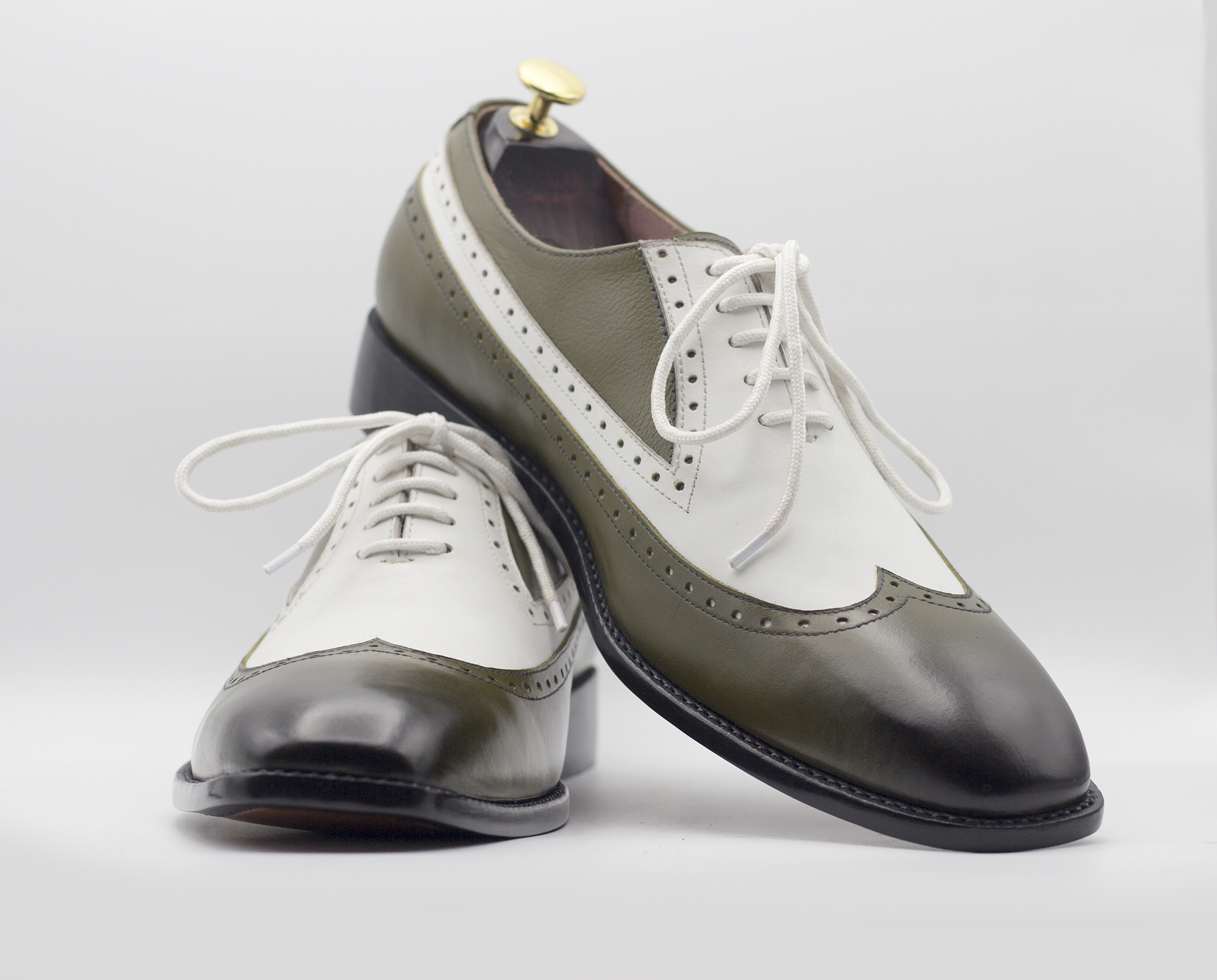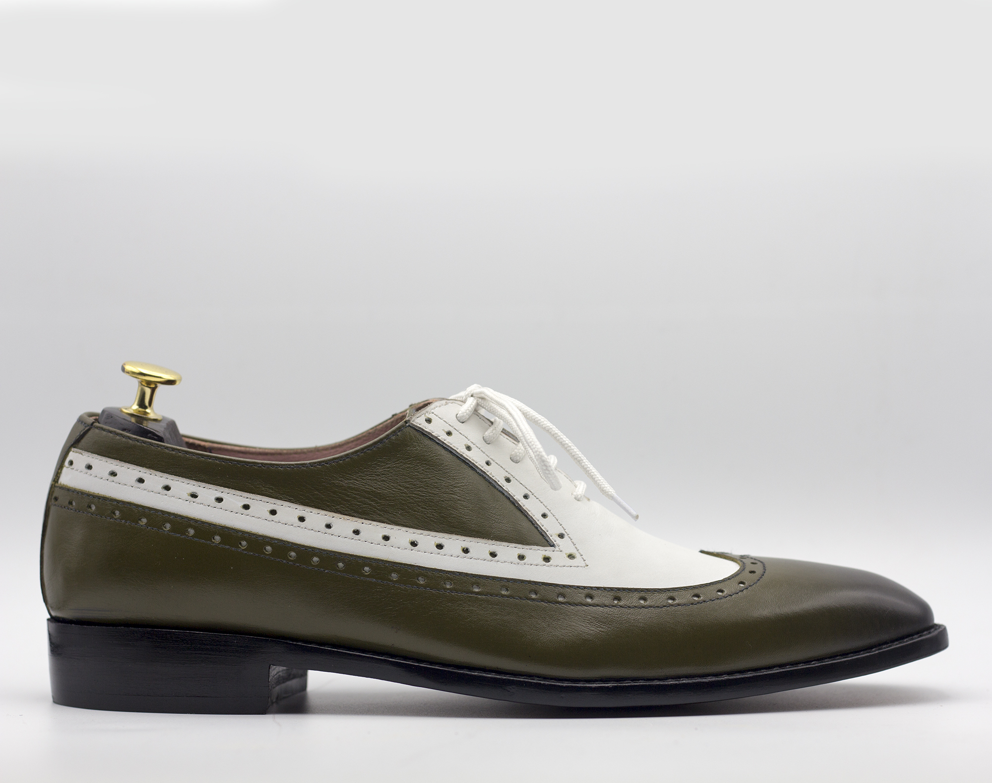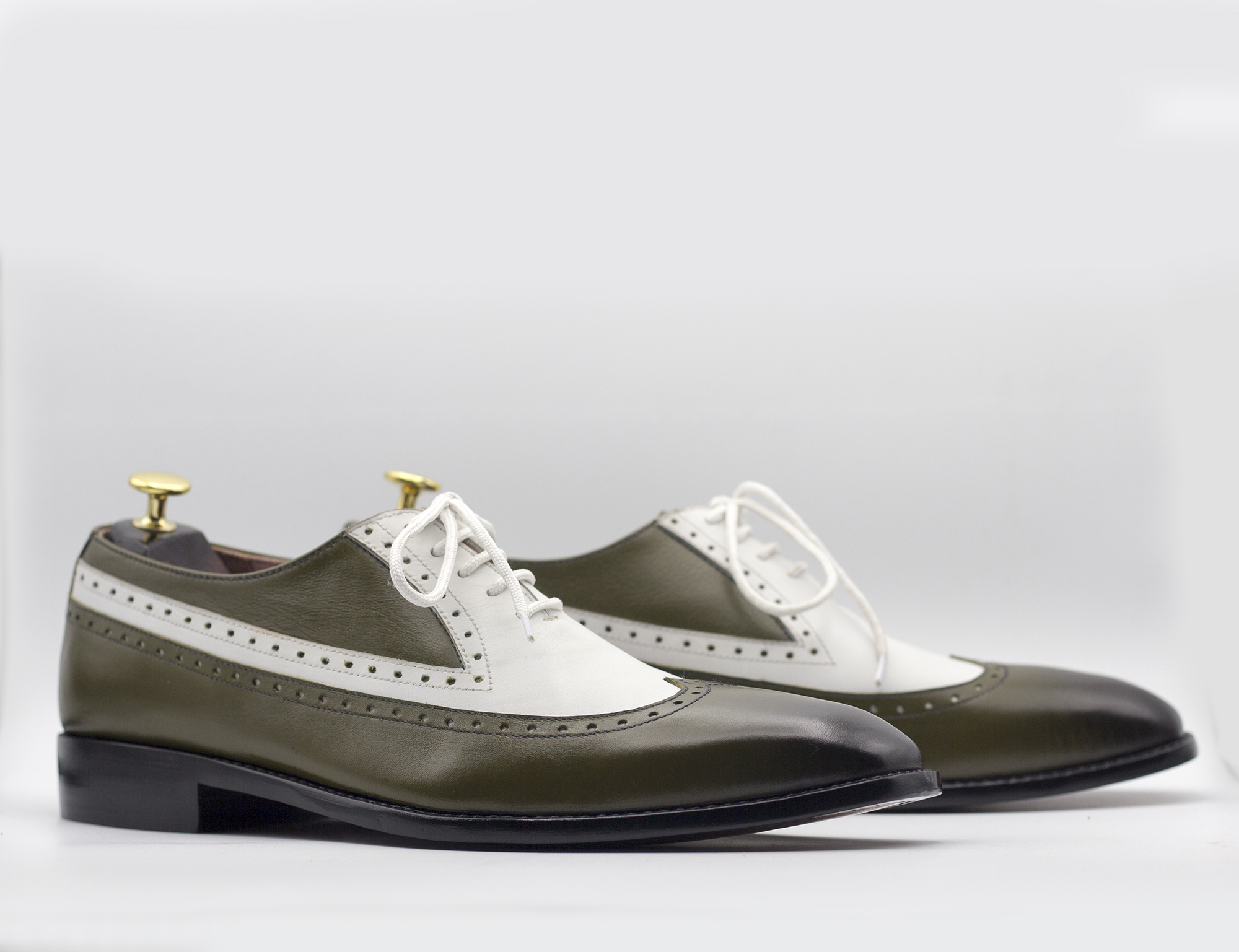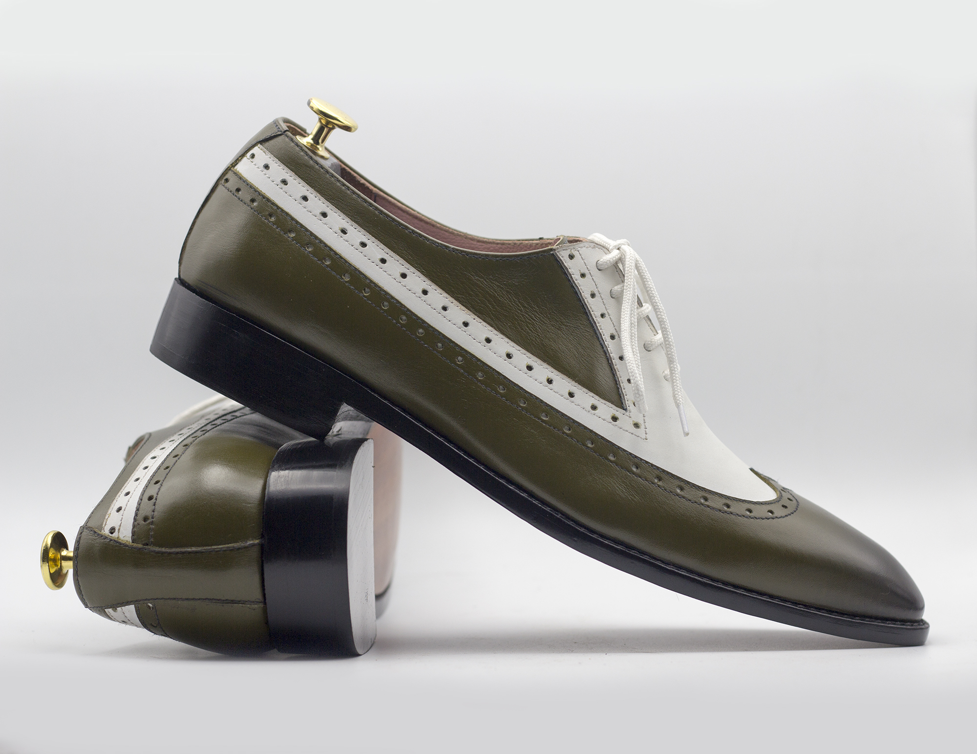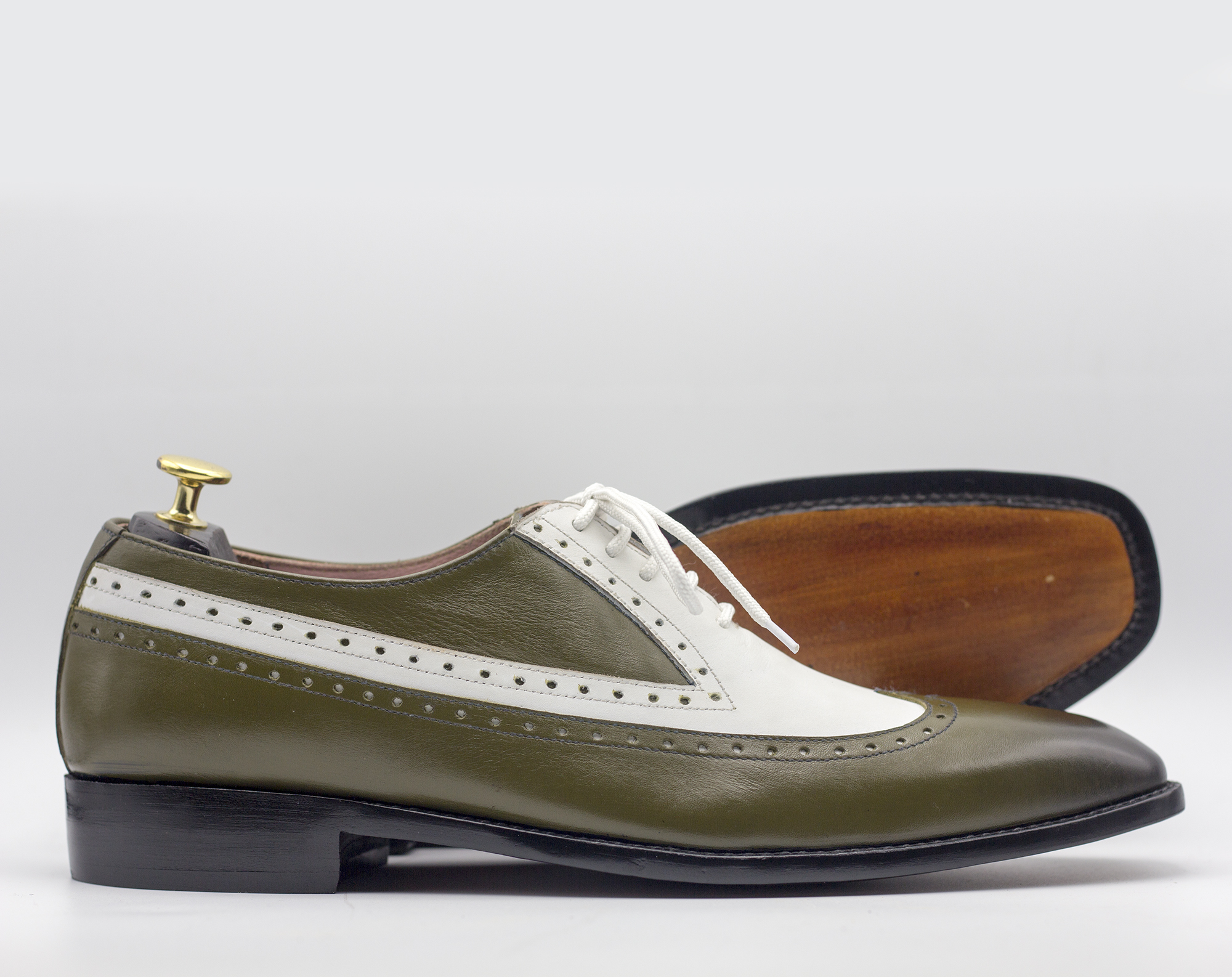 Handmade Green White Lace Up Wing Tip Leather Shoes