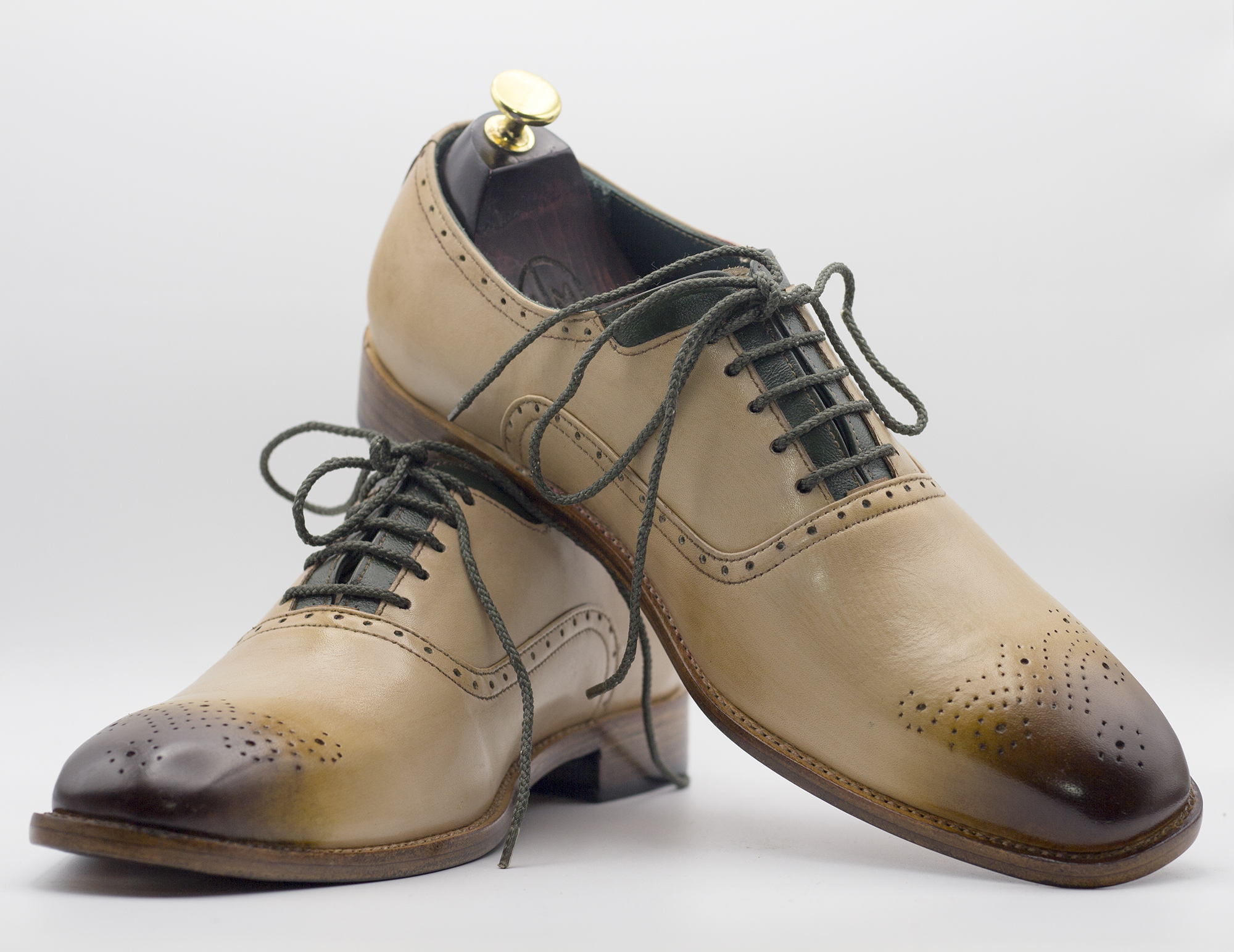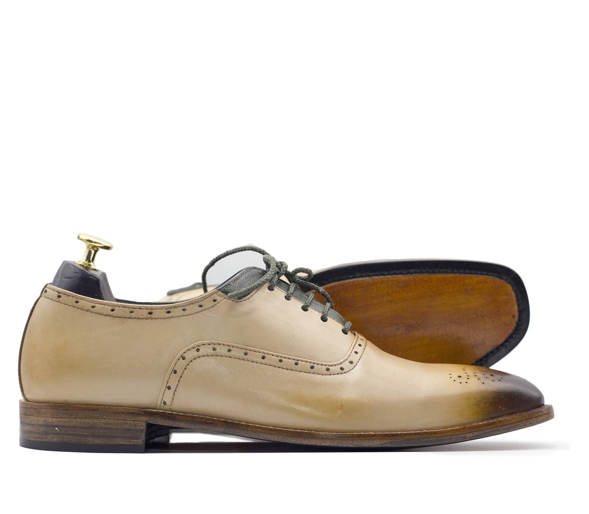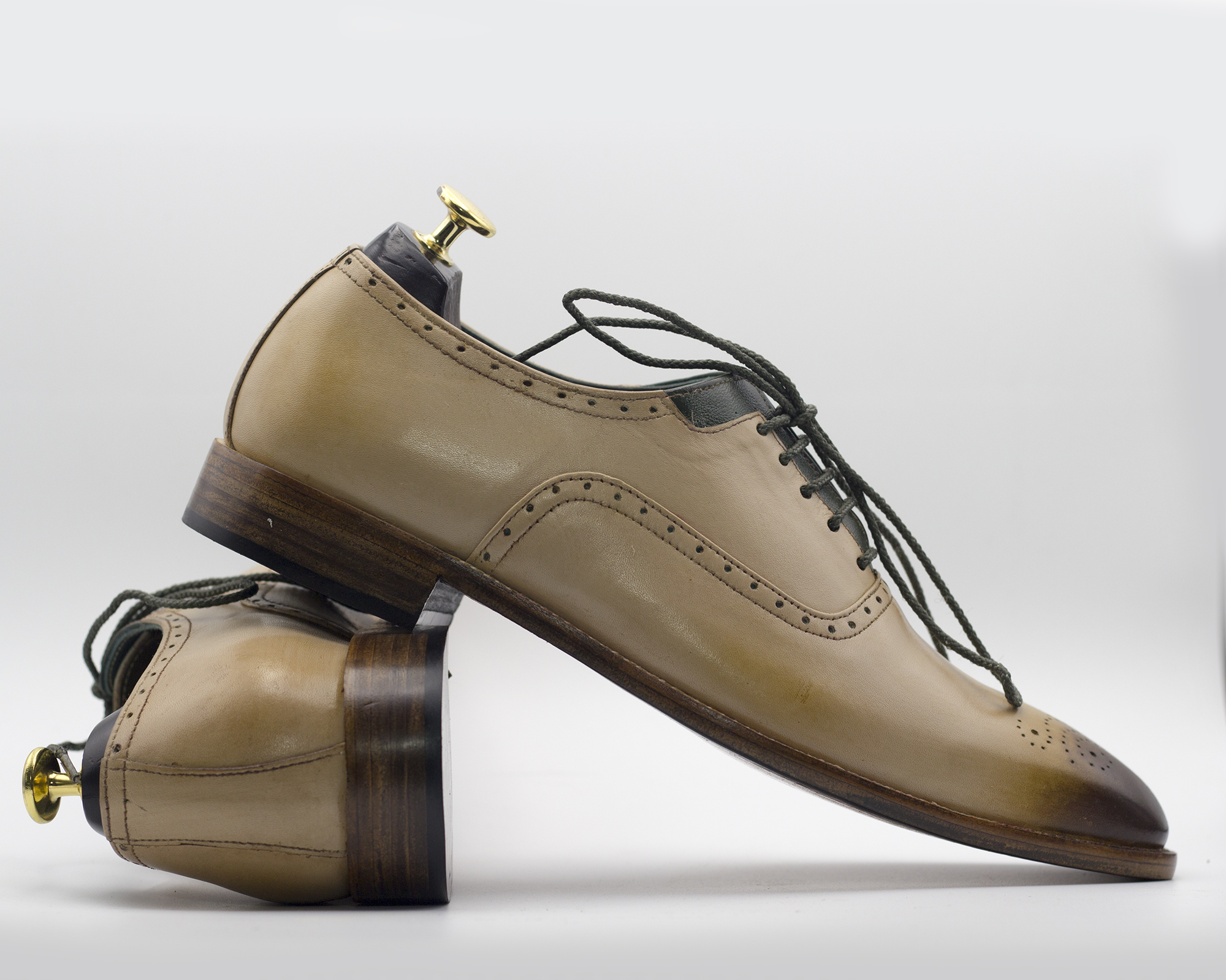 Men's Handmade Pointed Toe Beige Leather Lace Up Shoes