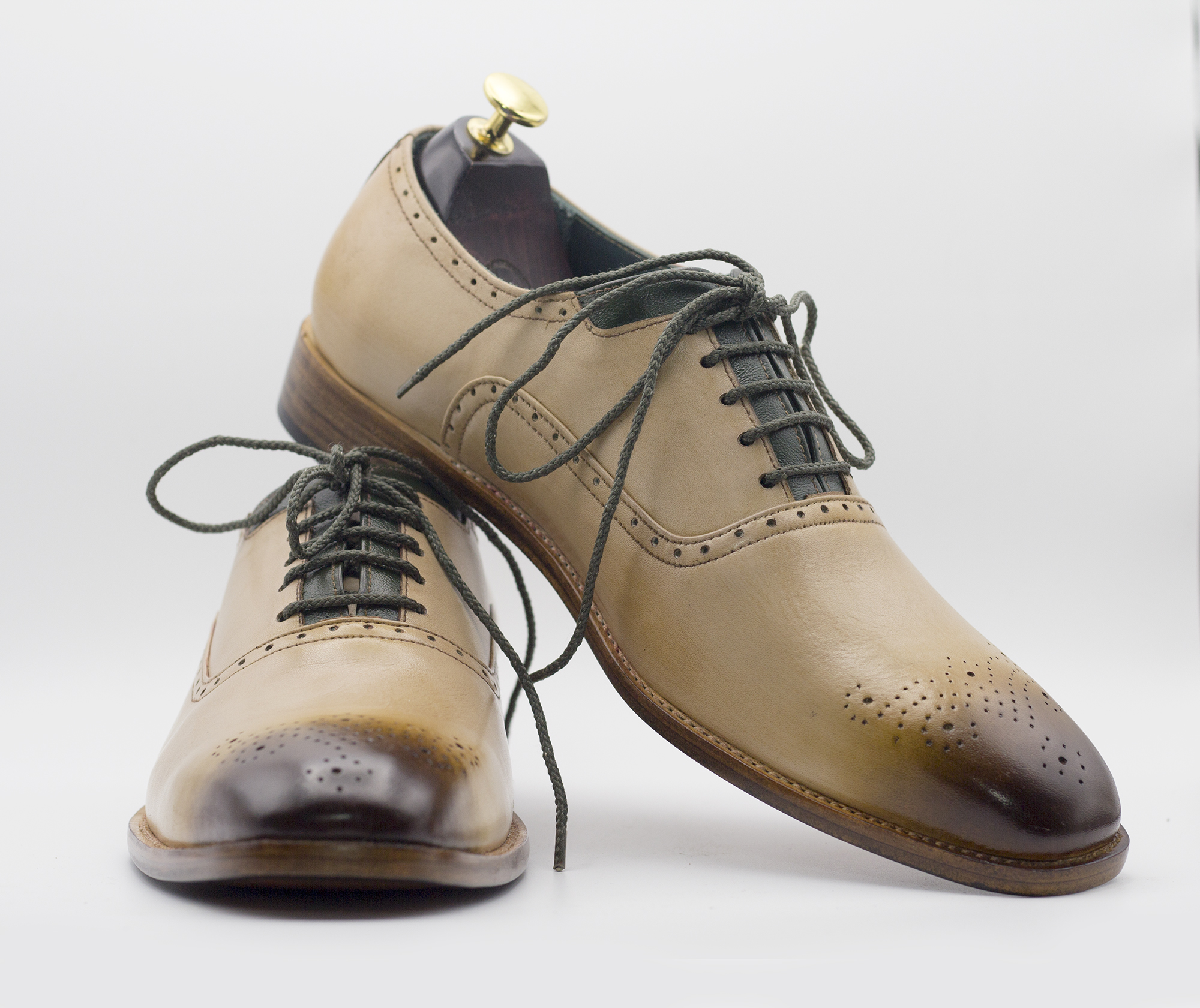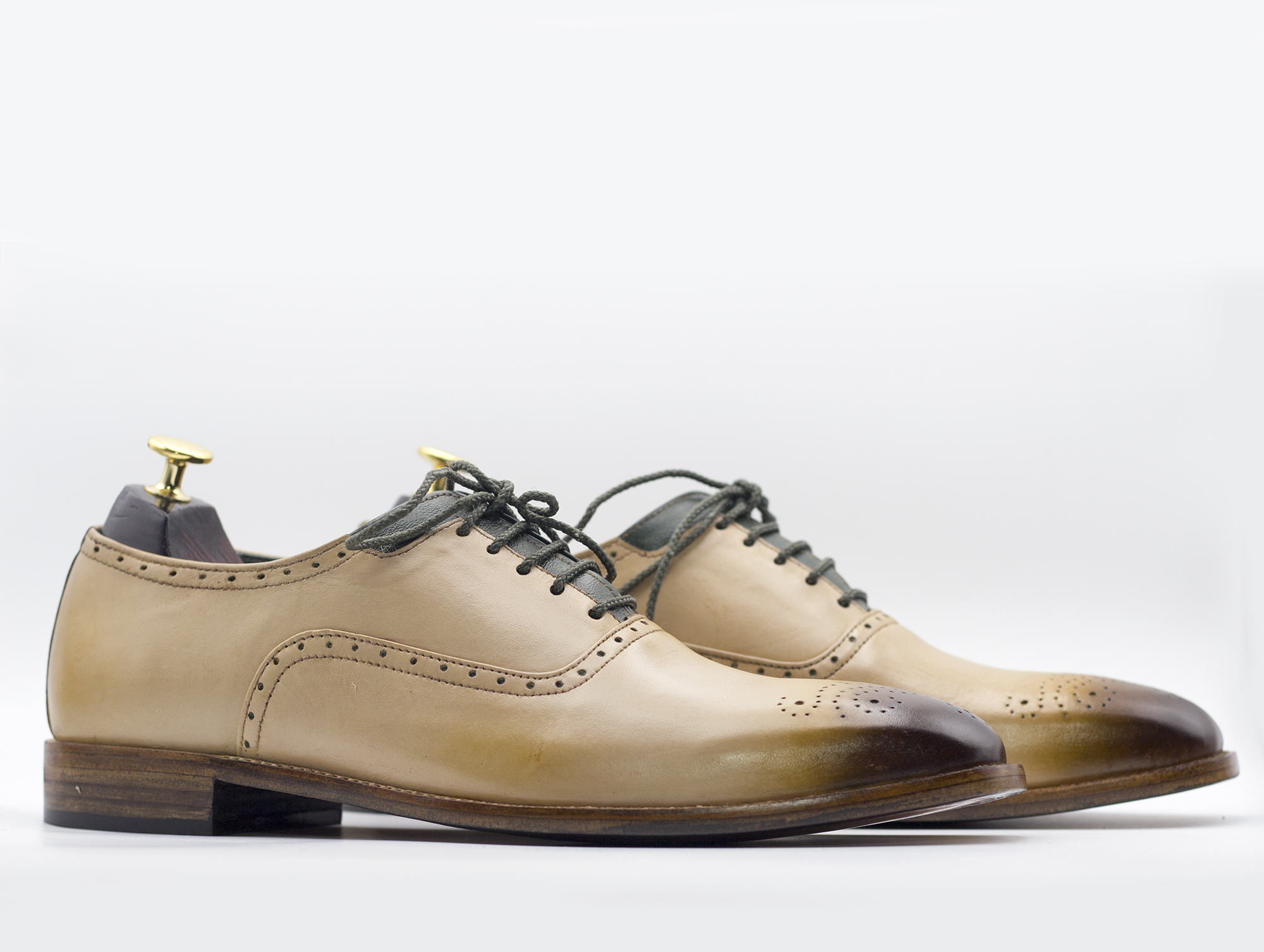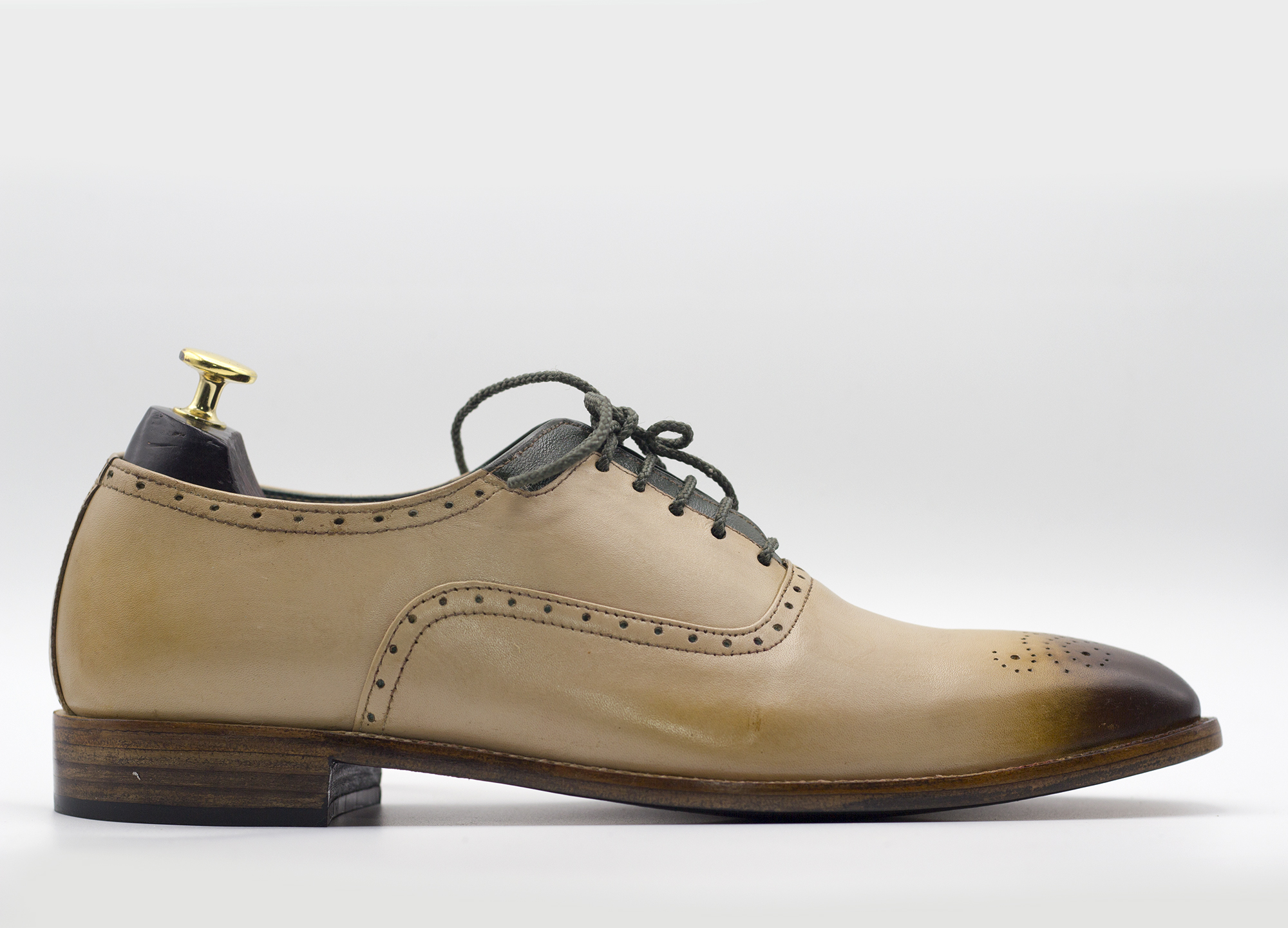Men's Handmade Pointed Toe Beige Leather Lace Up Shoes