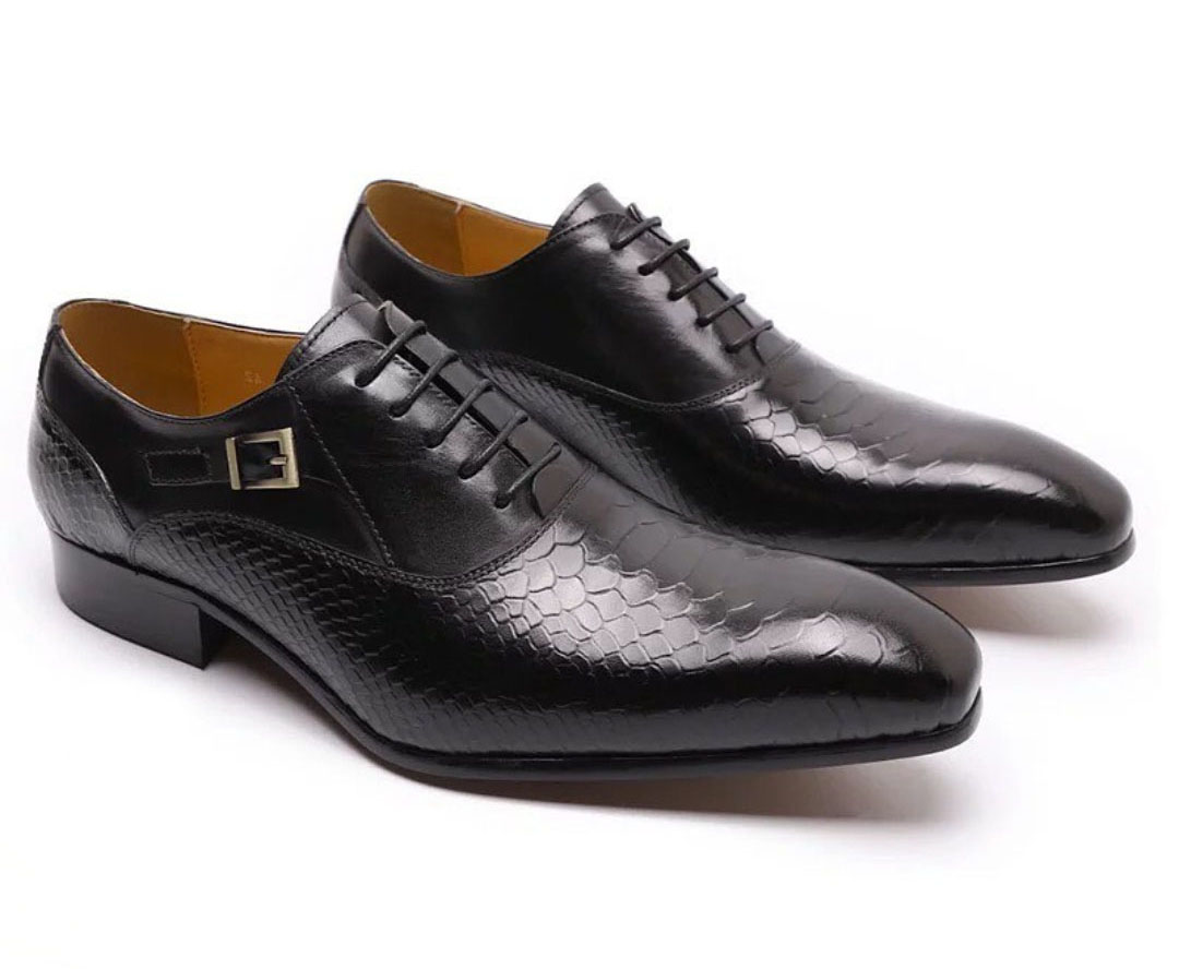 Black Lace Up Python Leather Side Buckle Shoes For Men