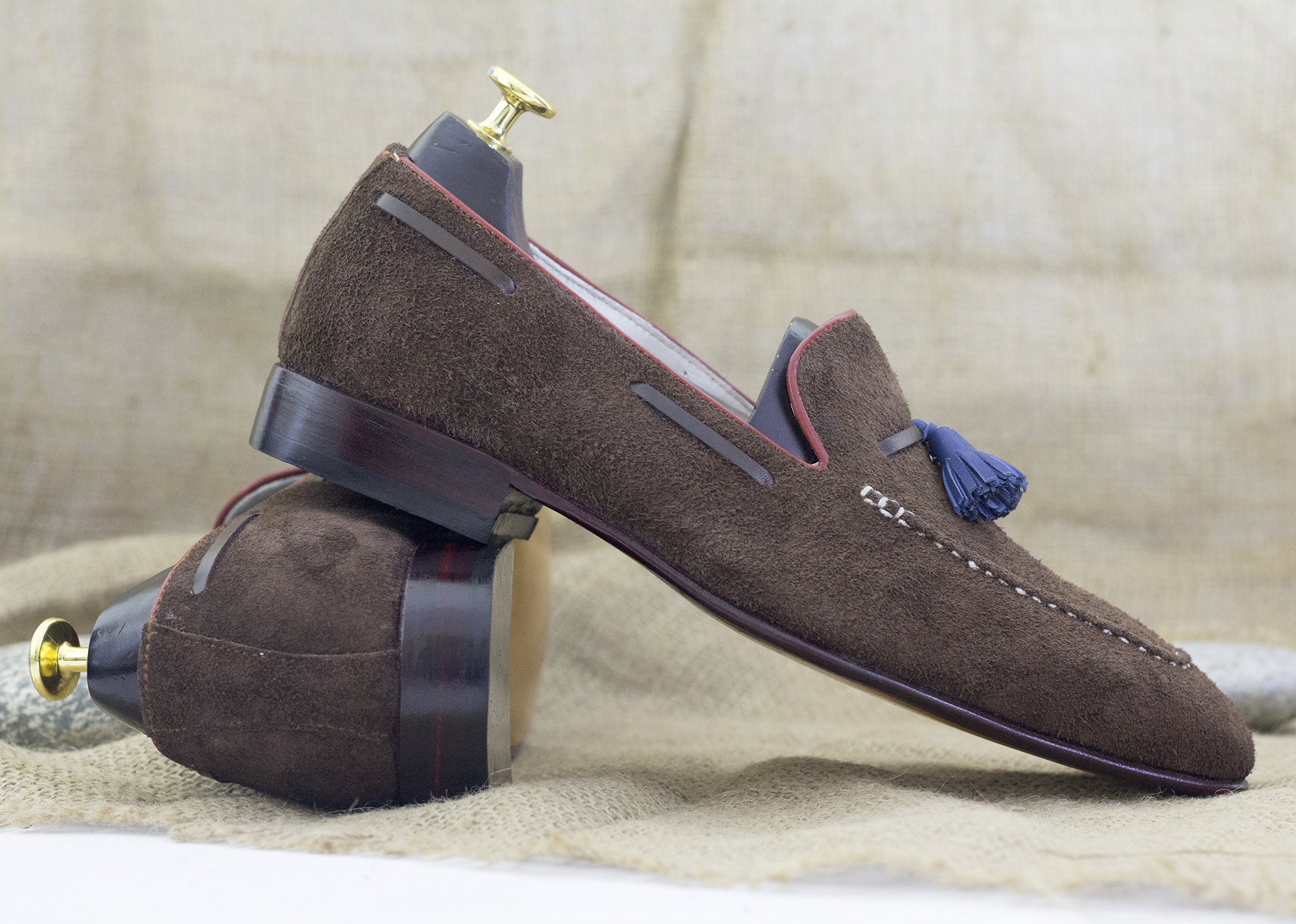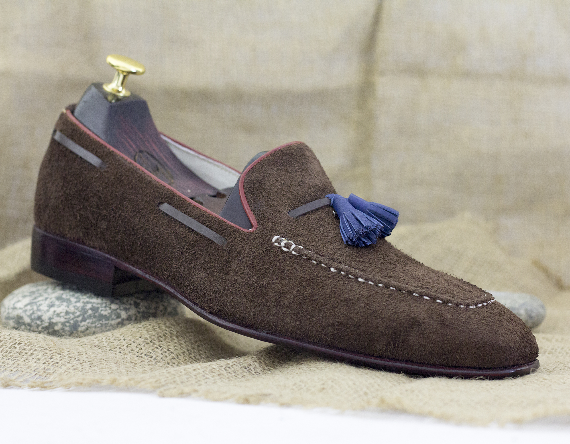 Whole Cut Brown Leather Suede Tasseled Leather Slip On Loafers
