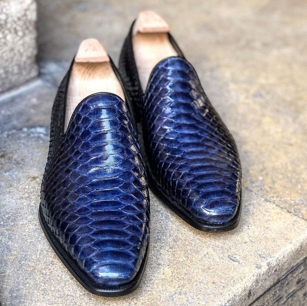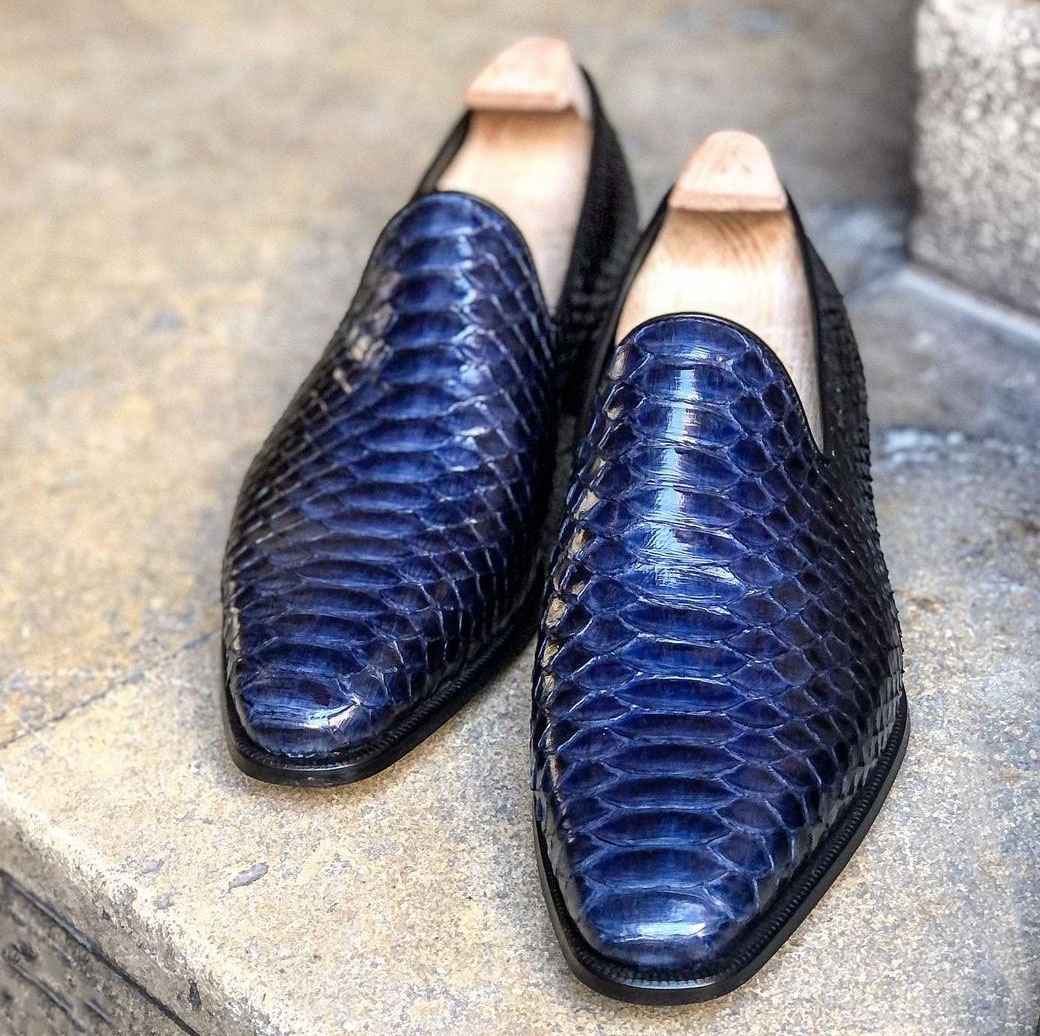 Navy Blue Python Leather Whole Cut Men's Slip On Loafers