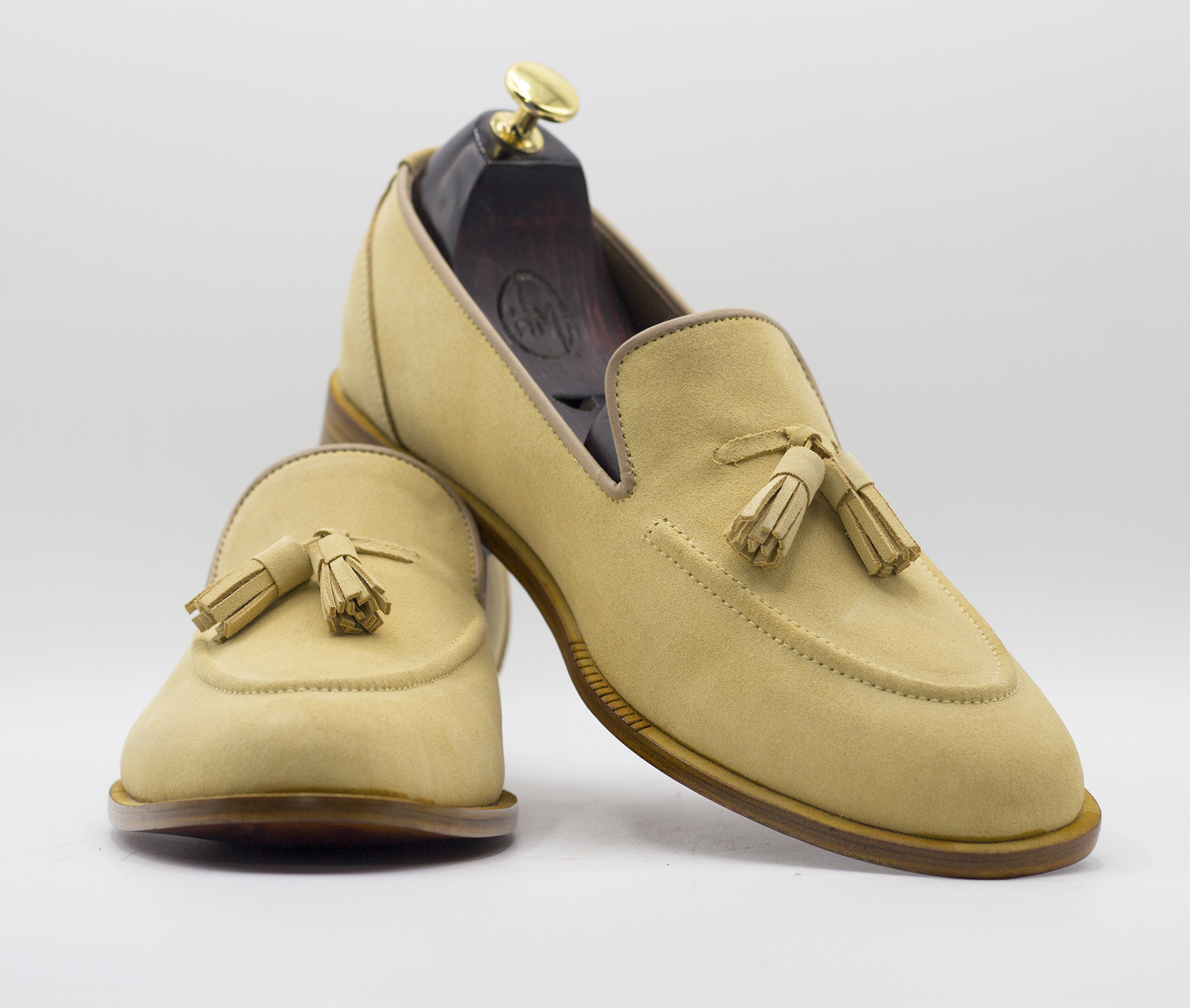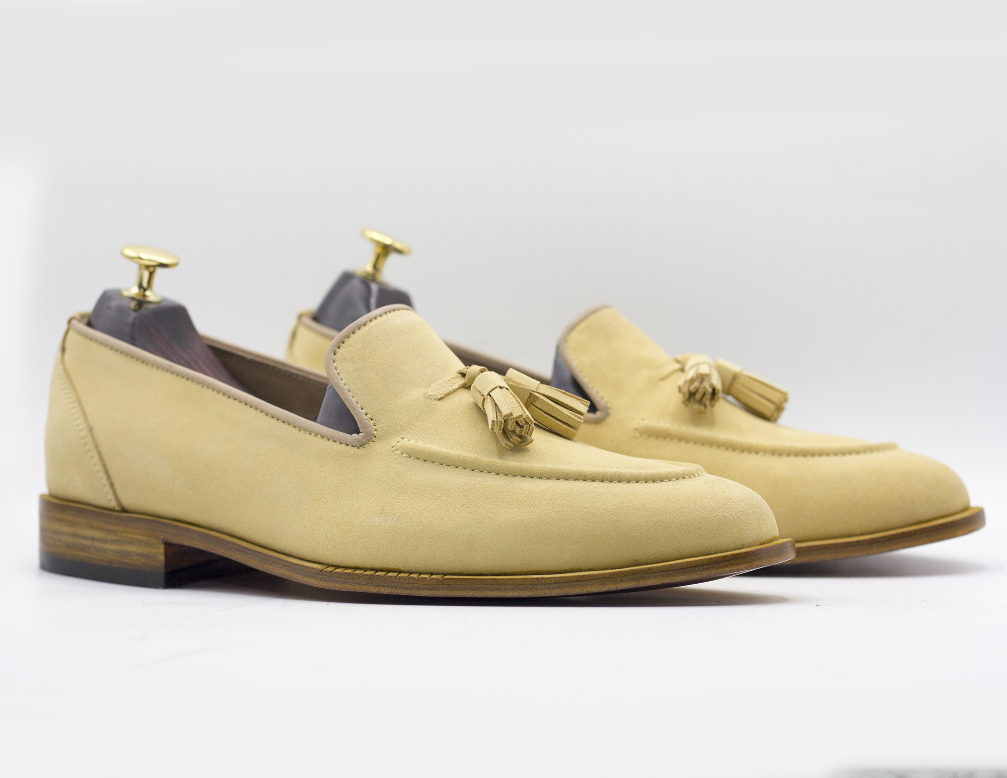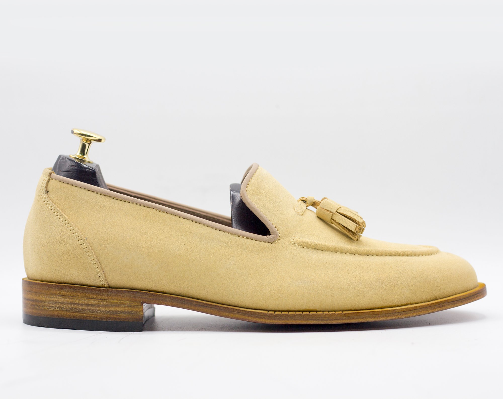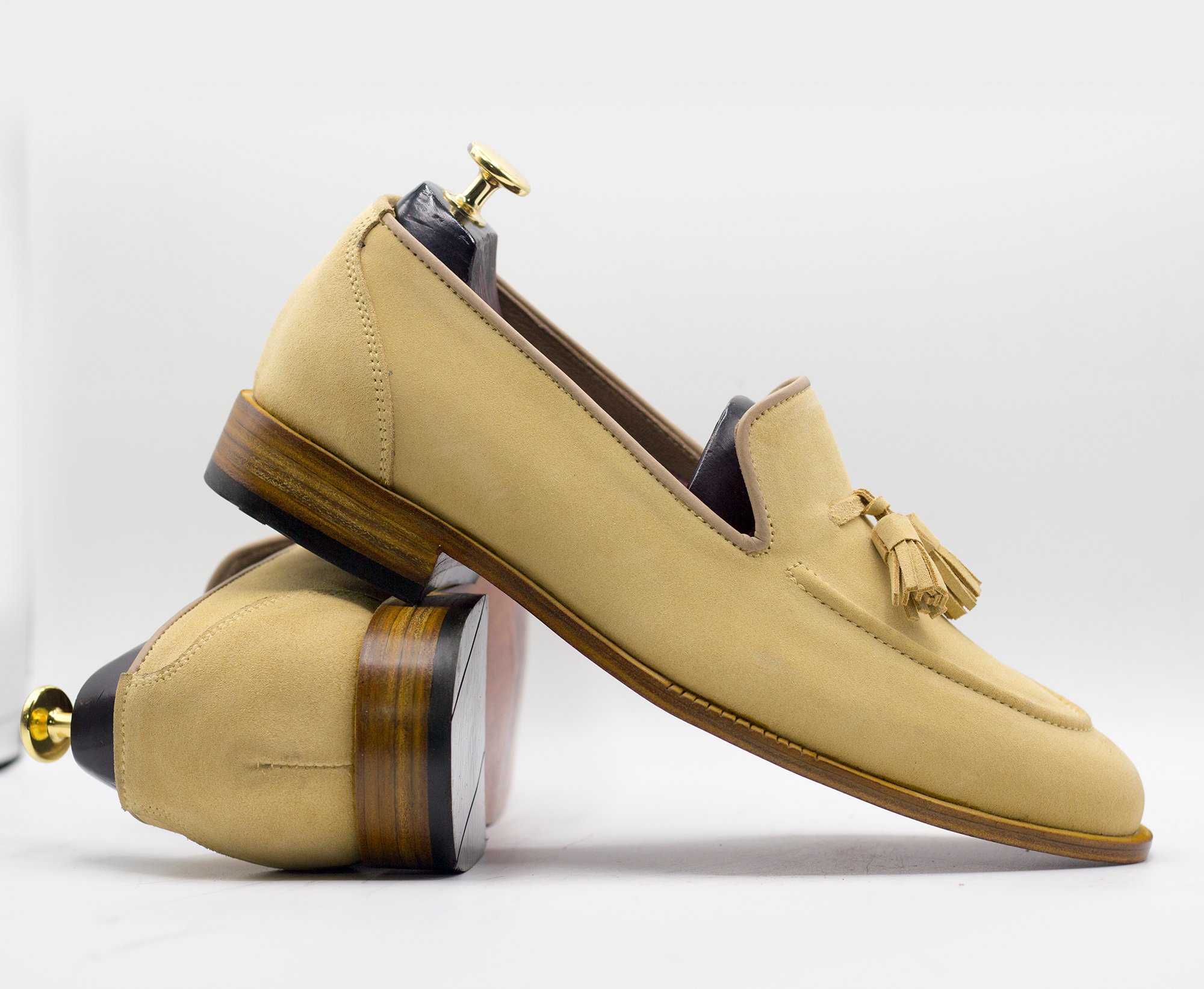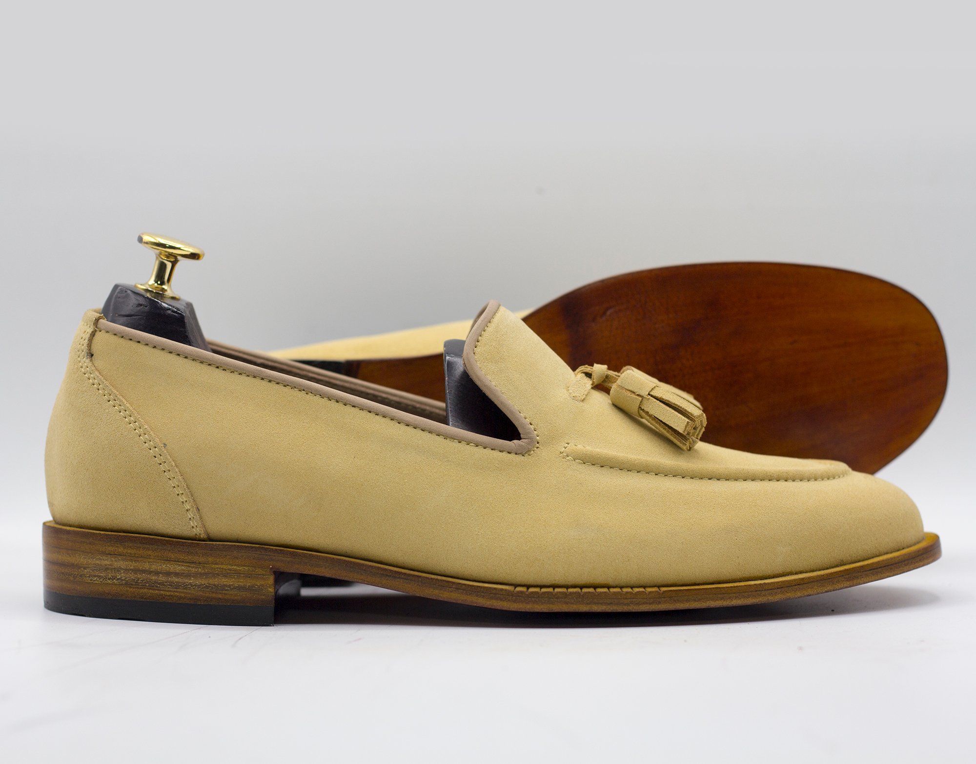 Handmade Beige Round Toe Tasseled Slip On Leather Suede Loafers