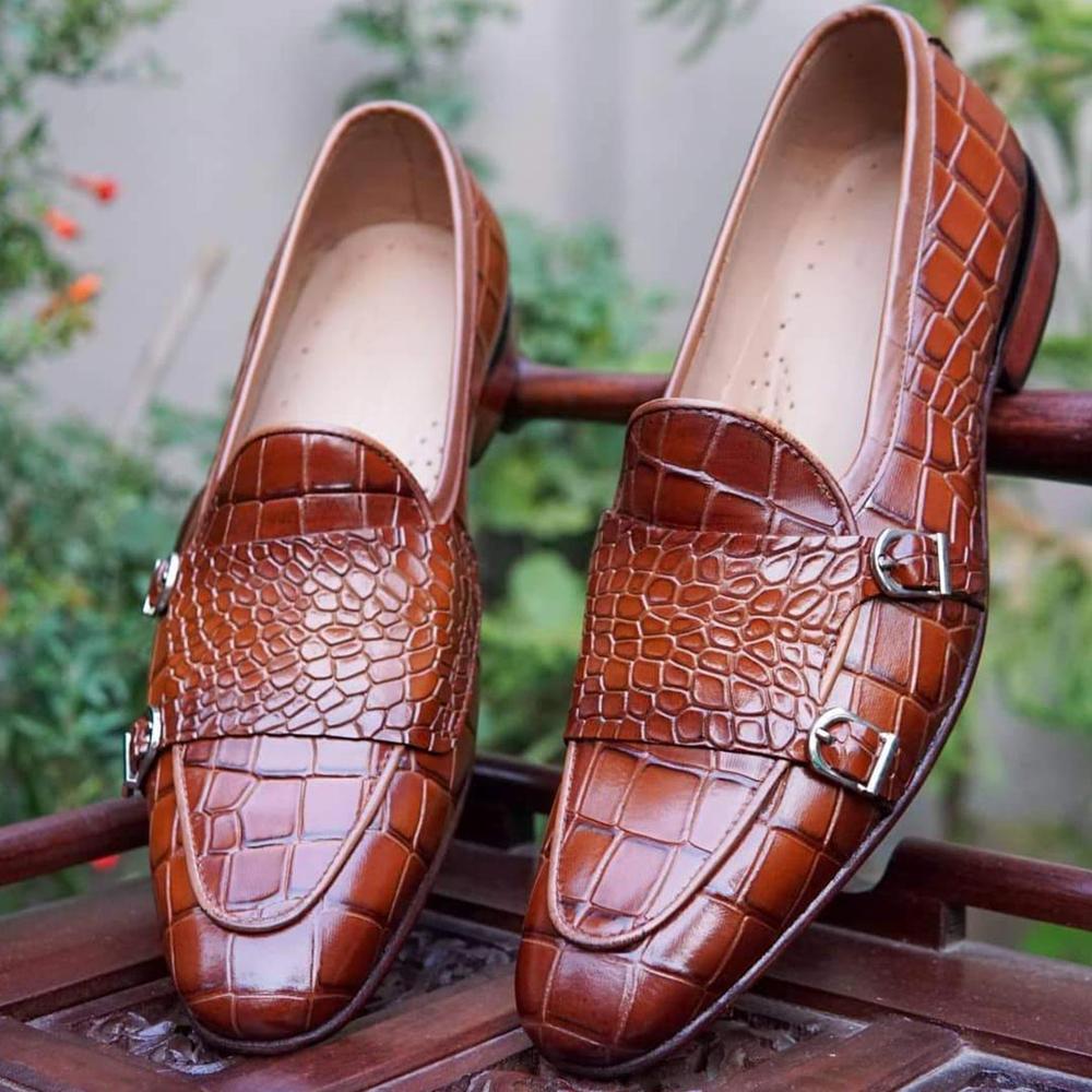 Hand Painted Brown Double Monk Alligator Texture Leather Slip On Loafers