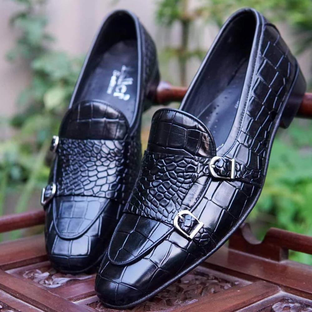 Pure Black Round Toe Double Monk Alligator Texture Leather Slip On Loafers
