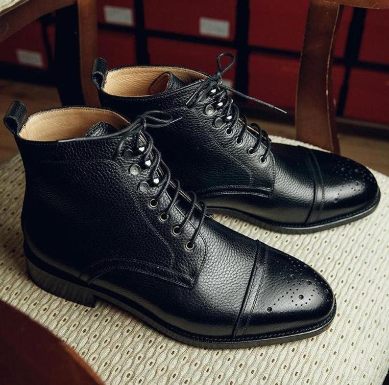 Cap Toe Pebbled Texture Black Leather Lace Up Ankle Boots