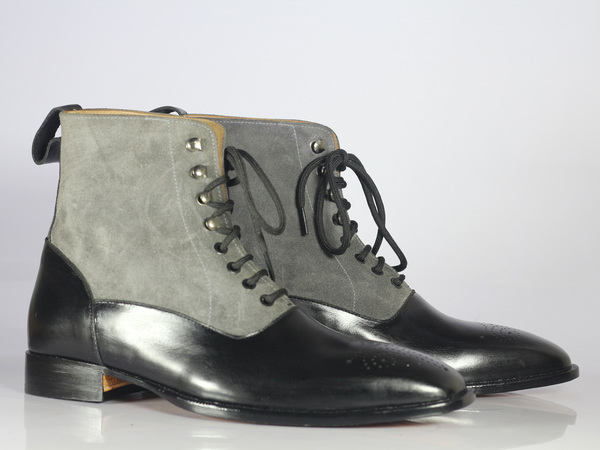 Men's Gray Black Ankle High Leather Suede Lace Up Boots