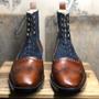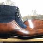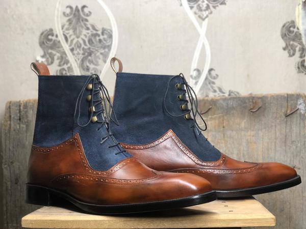 Men's Handmade Ankle High Brown Blue Wing Tip Leather Suede Lace Up Boot