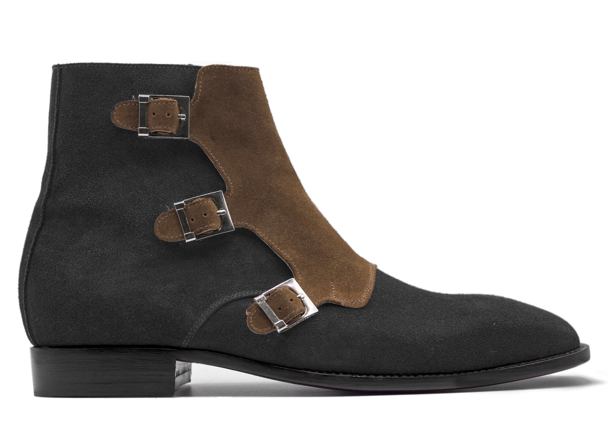 Hand Crafted Two Tone Tripple Monk Ankle High Leather Suede Boot