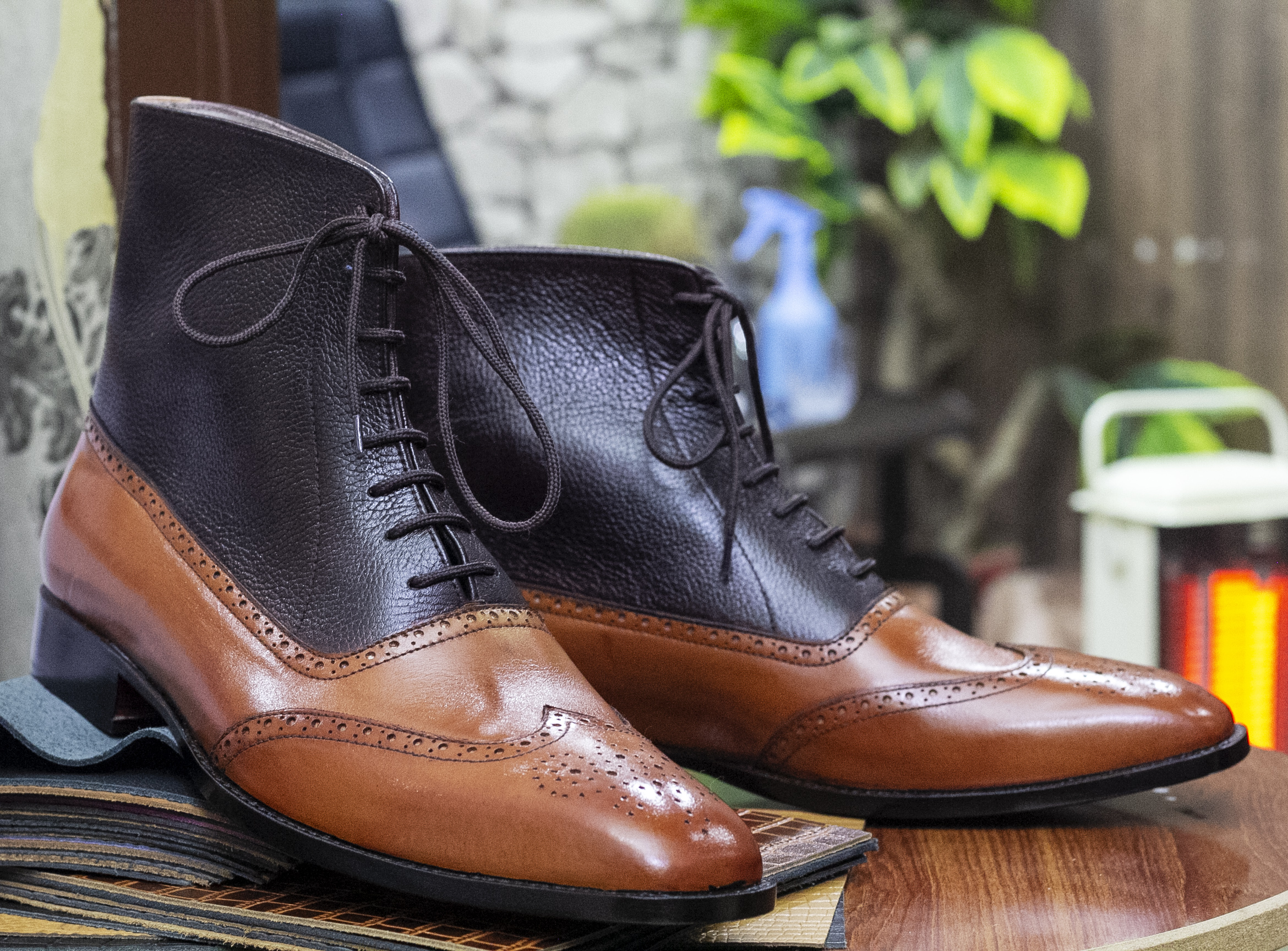 Handmade Two Tone Ankle High Wing Tip Leather Boot For Men