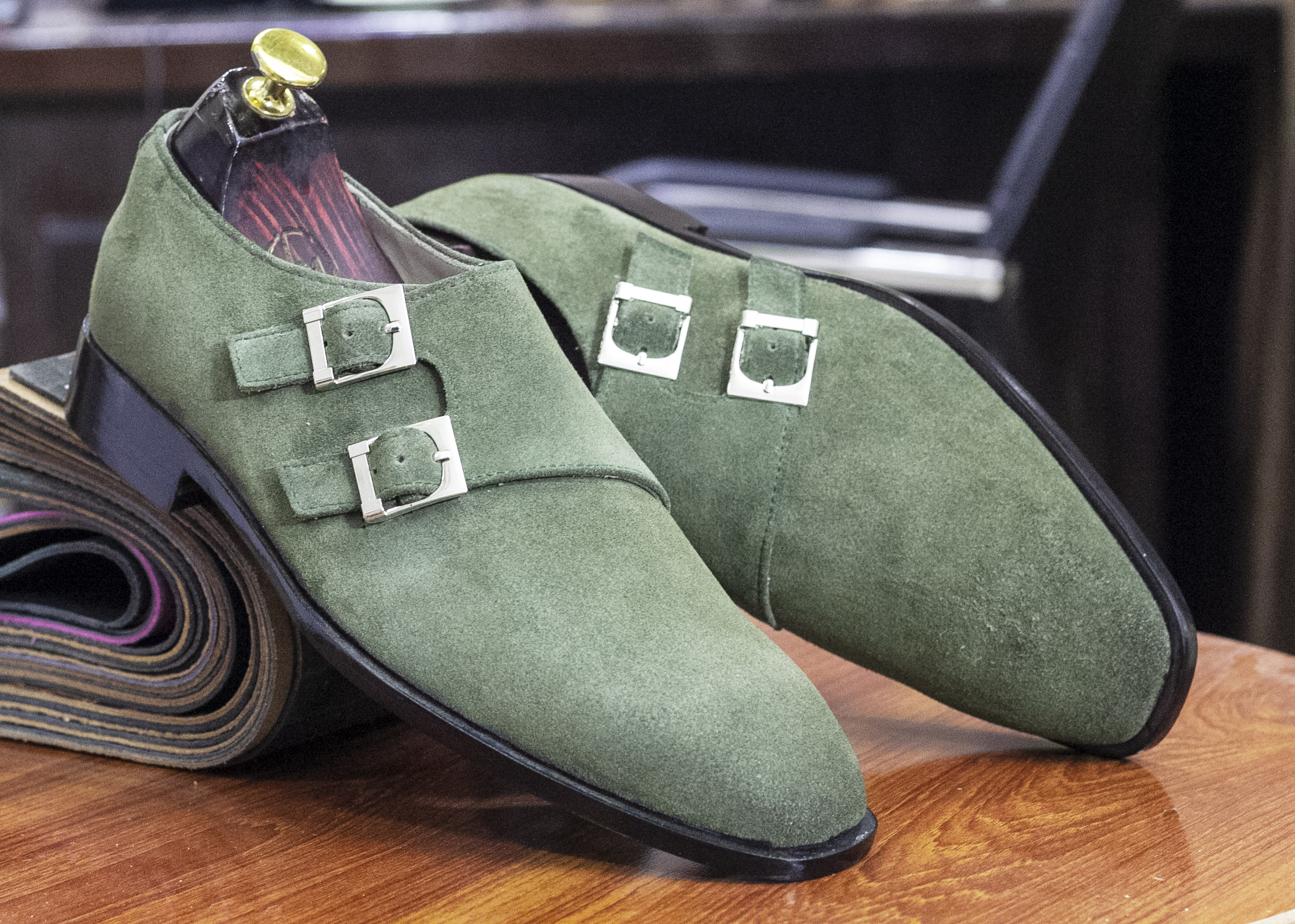Oxford Handmade Green Leather Suede Monk strap Shoes