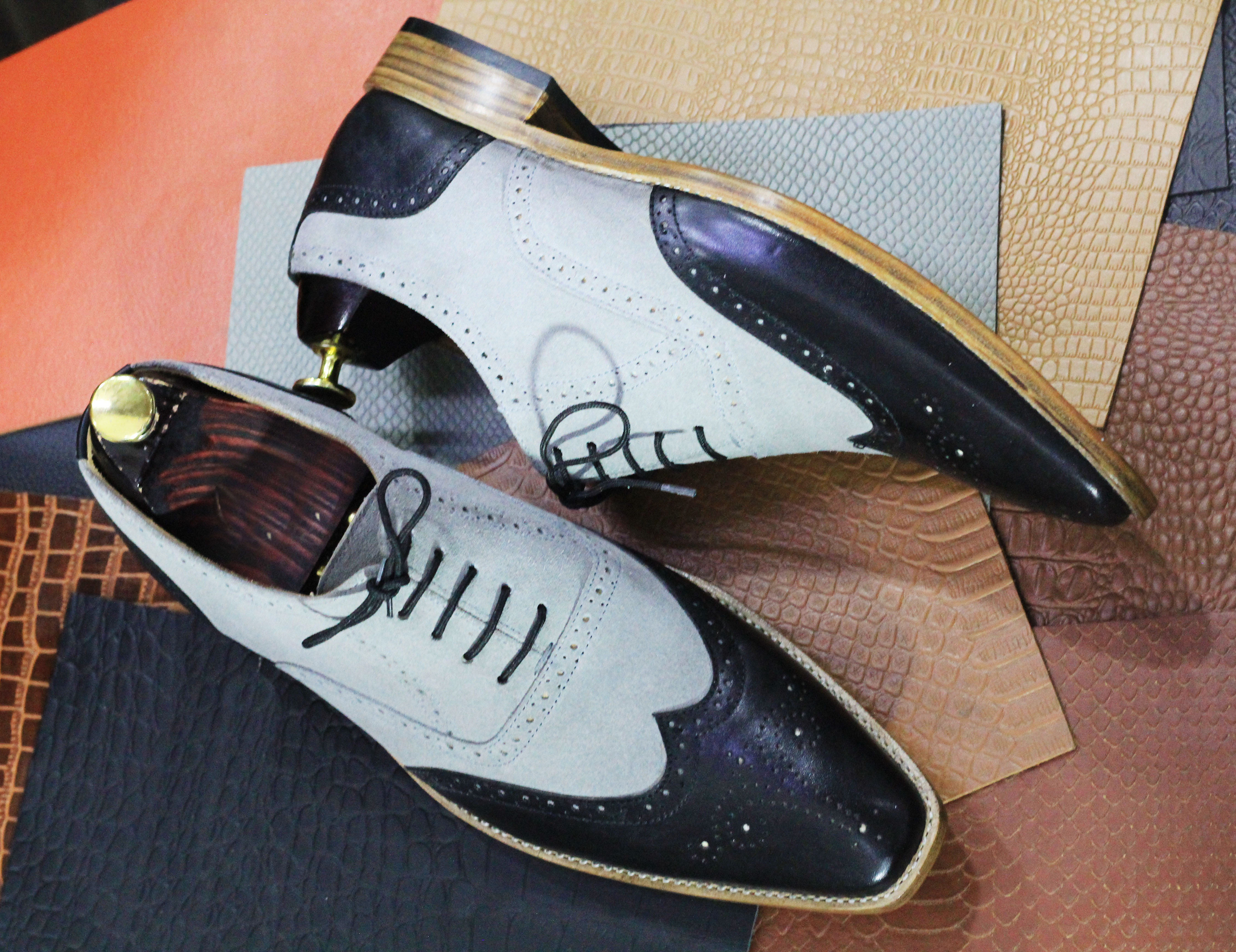 Oxford Handmade Two Tone Lace Up Wing tip Leather & Suede Shoes For Men