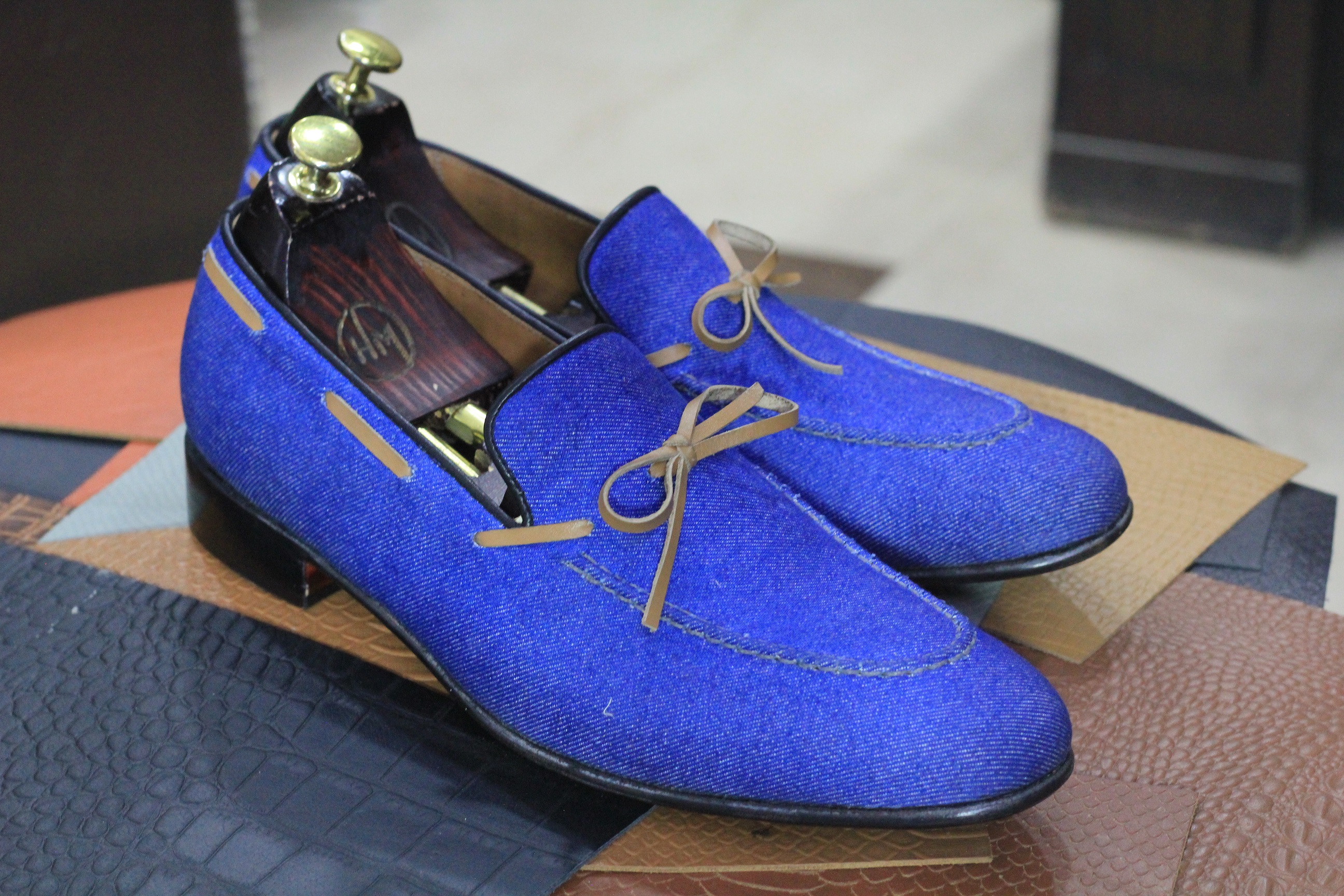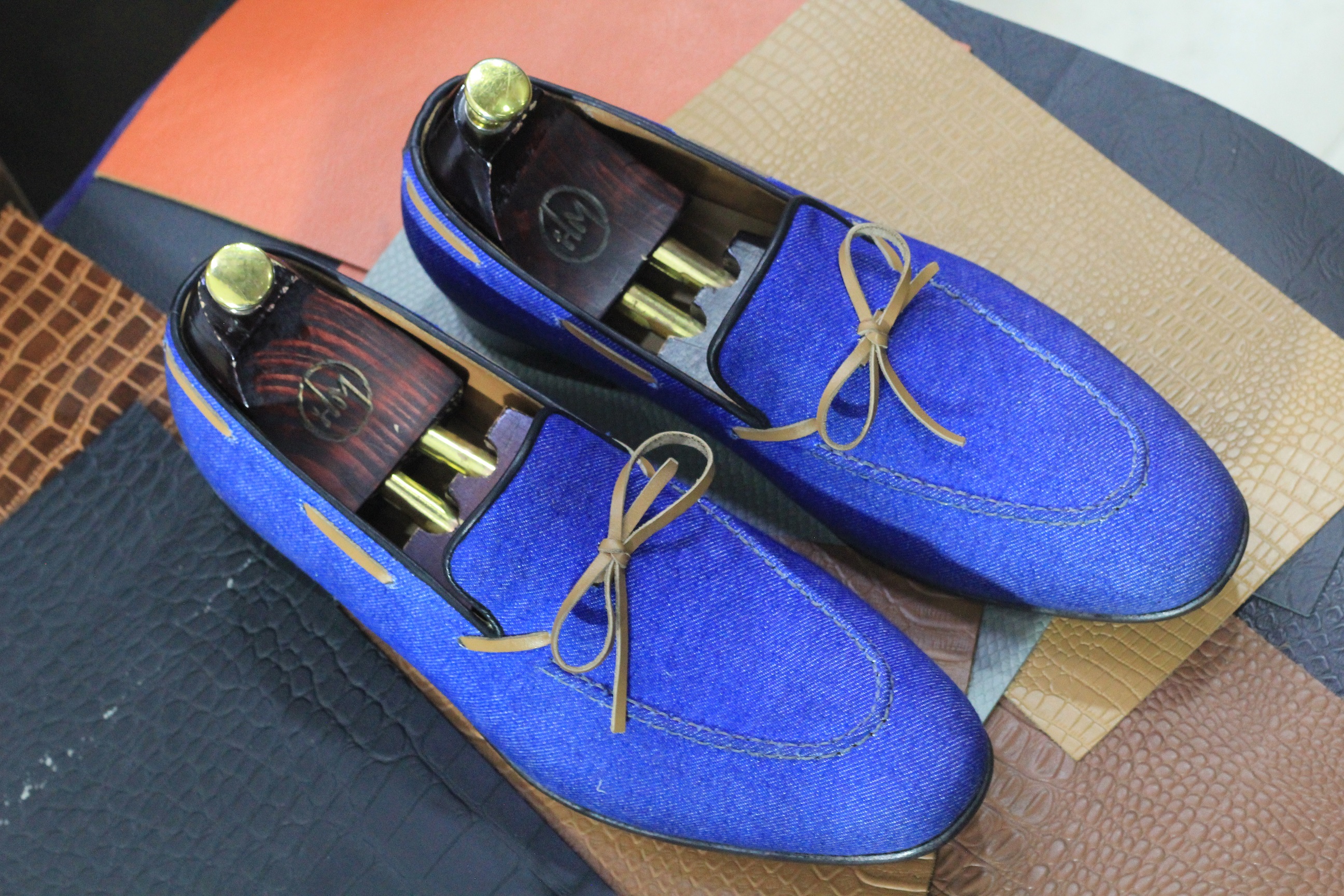 Handmade Slip On Bow Style Leather & Denim Penny Loafers For Men