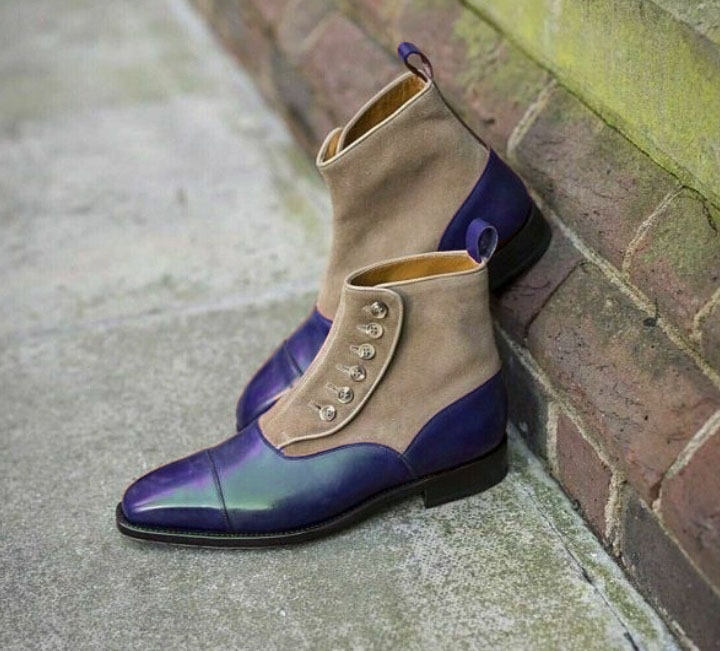 Men's Ankle High Button Top Cap Toe Patent Leather & Suede Boot.
